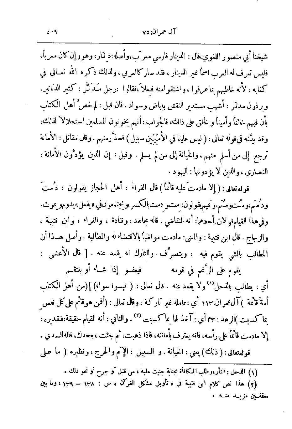 شيخنا أبي منصور اللغوي قال الدينار فارسي معرب وأصله دنار وهو وإن كان معربا فليس تعرف له العرب اسما غير الدينار فقد صار كالعربي ولذلك ذكره الله تعالى في كتابه لأنه خاطبهم بما عرفوا واشتقوا منه فعلا فقالوا رجل مدنر كثير الدنانير وبرذون مدنر أشهب مستدير النقش ببياض وسواد فان قيل لم خص أهل الكتاب بأن فيهم خائنا وأمينا والخلق على ذلك فالجواب انهم يخونون المسليمن استحلالا لذلك وقد بينه في قوله تعالى ليس علينا في الأميين سبيل فحذر منهم وقال مقاتل الأمانة ترجع إلى من أسلم منهم والخيانة إلى من لم يسلم وقيل إن الذين يؤدون الأمانة النصارى والذين لا يؤدونها اليهود
