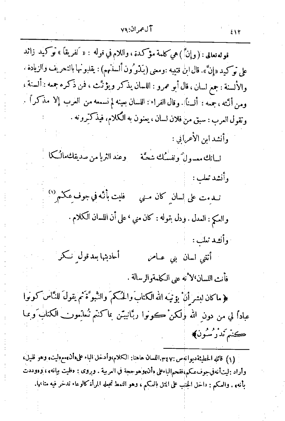 قوله تعالى وإن هي كلمة مؤكدة واللام في قوله لفريقا بتوكيد زائد على توكيد إن قال ابن قتيبة ومعنى يلوون ألسنتهم يقلبونها بالتحريف والزيادة والألسنة جمع لسان قال أبو عمرو واللسان يذكر ويؤنث فمن ذكره جمعه ألسنه ومن أنثه جمعه ألسنا وقال الفراء اللسان بعينه لم نسمعه من العرب إلا مذكرا وتقول العرب سبق من فلان لسان يعنون به الكلام فيذكرونه