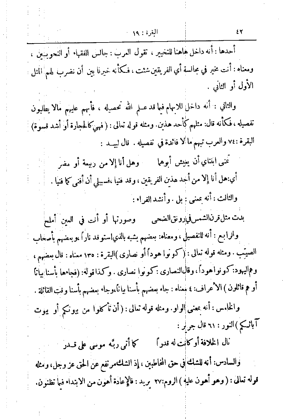 والرابع أنه للتفصيل ومعناه بعضهم يشبه بالذي استوقد نارا وبعضهم بأصحاب الصيب ومثله قوله تعالى كونوا هودا أو نصارى البقرة 135 معناه قال بعضهم وهم إليهود كونوا هودا وقال النصارى كونوا نصارى وكذا قوله فجاءها بأسنا بياتا أو هم قائلون الأعراف 4 معناه جاء بعضهم بأسنا بياتا وجاء بعضهم بأسنا وقت القائلة