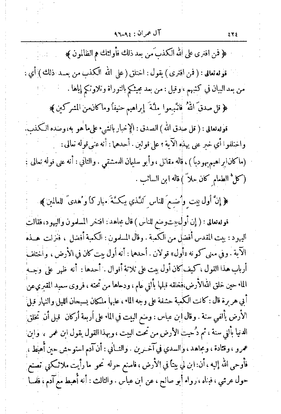 قوله تعالى إن أول بيت وضع للناس قال مجاهد افتخر المسلمون واليهود فقالت اليهود بيت المقدس افضل من الكعبة وقال المسلمون الكعبة أفضل فنزلت هذه الآية وفي معنى كونه أول قولان أحدهما أنه أول بيت كان في الأرض واختلف أرباب هذا القول كيف كان أول بيت على ثلاثة أقوال أحدها أنه ظهر على وجه الماء حين خلق الله الارض فخلقه قبلها بألفي عام ودحاها من تحته فروى سعيد المقبري عن أبي هريرة قال كانت الكعبة حشفة على وجه الماء عليها ملكان يسبحان الليل والنهار قبل الأرض بألفي سنة وقال ابن عباس وضع البيت في الماء على أربعة اركان قبل أن تخلق الدنيا بألفي سنة ثم دحيت الأرض من تحت البيت وبهذا القول يقول ابن عمر وابن عمرو وقتادة و مجاهد والسدي في آخرين والثاني أن آدم استوحش حين أهبط فأوحى الله إليه أن ابن لي بيتا في الأرض فاصنع حوله نحو ما رايت ملائكتي تصنع حول عرشي فبناه رواه أبو صالح عن ابن عباس والثالث أنه أهبط مع آدم فلما