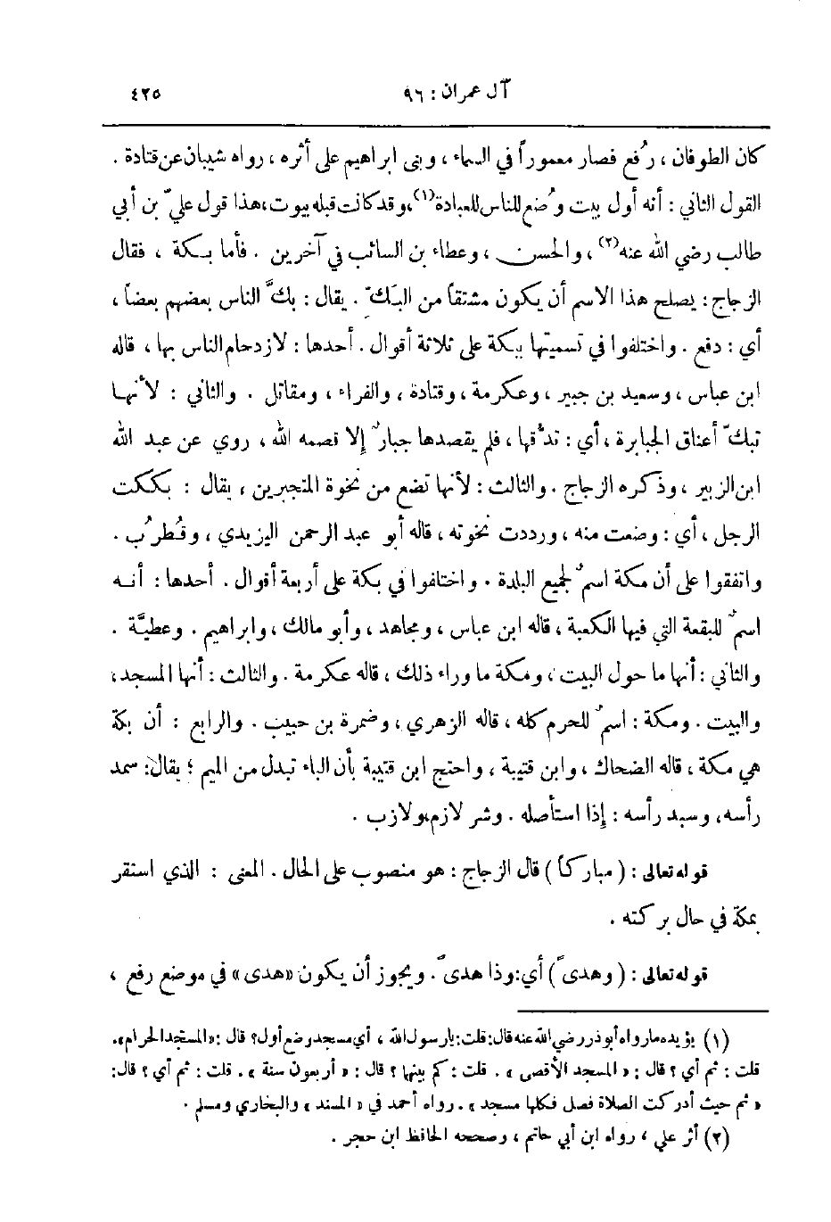 كان الطوفان رفع فصار معمورا في السماء وبنى إبراهيم على أثره رواه شيبان عن قتادة القول الثاني أنه أول بيت وضع للناس للعبادة وقد كانت قبله بيوت هذا قول علي بن أبي طالب رضي الله عنه والحسن وعطاء بن السائب في آخرين فأما بكة فقال الزجاج يصلح هذا الاسم أن يكون مشتقا من البك يقال بك الناس بعضهم بعضا أي دفع واختلفوا في تسميتها بكة على ثلاثة أقوال أحدها لازدحام الناس بها قاله ابن عباس وسعيد بن جبير وعكرمة وقتادة و الفراء و مقاتل والثاني لأنها تبك أعناق الجبابرة أي تدقها فلم يقصدها جبار إلا قصمه الله روي عن عبد الله ابن الزبير وذكره الزجاج والثالث لأنها تضع من نخوة المتجبرين يقال بككت الرجل أي وضعت منه ورددت نخوته قاله أبو عبد الرحمن اليزيدي وقطرب واتفقوا على أن مكة اسم لجميع البلدة واختلفوا في بكة على أربعة أقوال أحدها أنه اسم للبقعة التي فيها الكعبة قاله ابن عباس و مجاهد وابو مالك وابراهيم وعطية والثاني أنها ما حول البيت ومكة ما وراء ذلك قاله عكرمة والثالث أنها المسجد والبيت ومكة اسم للحرم كله قاله الزهري وضمرة بن حبيب والرابع أن بكة هي مكة قاله الضحاك و ابن قتيبة واحتج ابن قتيبة بأن الباء تبدل من الميم يقال سمد رأسه وسبد رأسه إذا استأصله وشر لازم ولازب