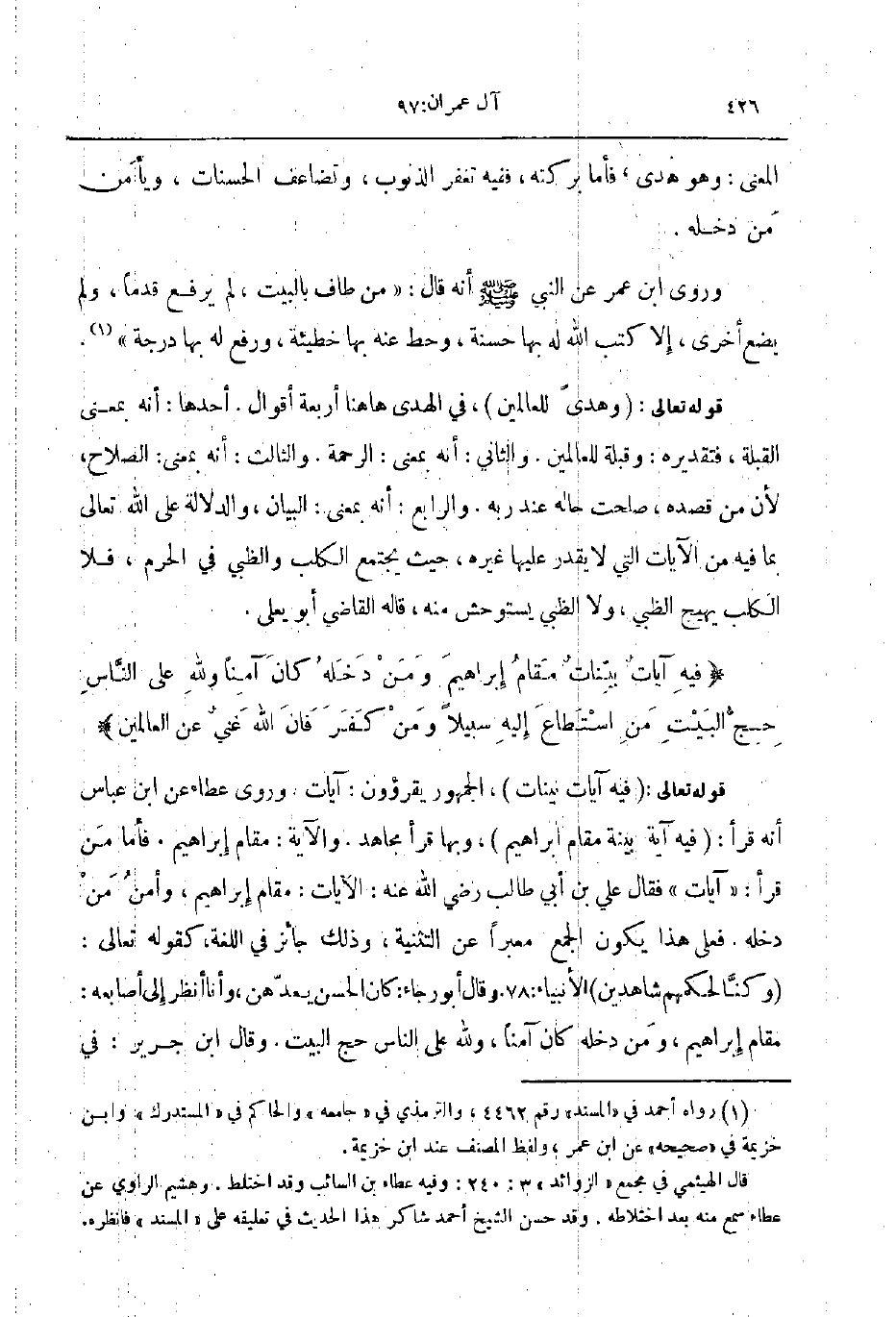 قوله تعالى فيه آيات بينات الجمهور يقرؤون آيات وروى عطاء عن ابن عباس أنه قرأ فيه آية بينة مقام إبراهيم وبها قرأ مجاهد والاية مقام إبراهيم فأما من قرأ آيات فقال علي بن أبي طالب رضي الله عنه الآيات مقام ابراهيم و أمن من دخله فعلى هذا يكون الجمع معبرا عن التثنية وذلك جائز في اللغة كقوله تعالى وكنا لحكمهم شاهدين الانبياء 78 وقال أبو رجاء كان الحسن يعدهن و انا أنظر إلى أصابعه مقام إبراهيم ومن دخله كان آمنا ولله على الناس حج البيت وقال ابن جرير في