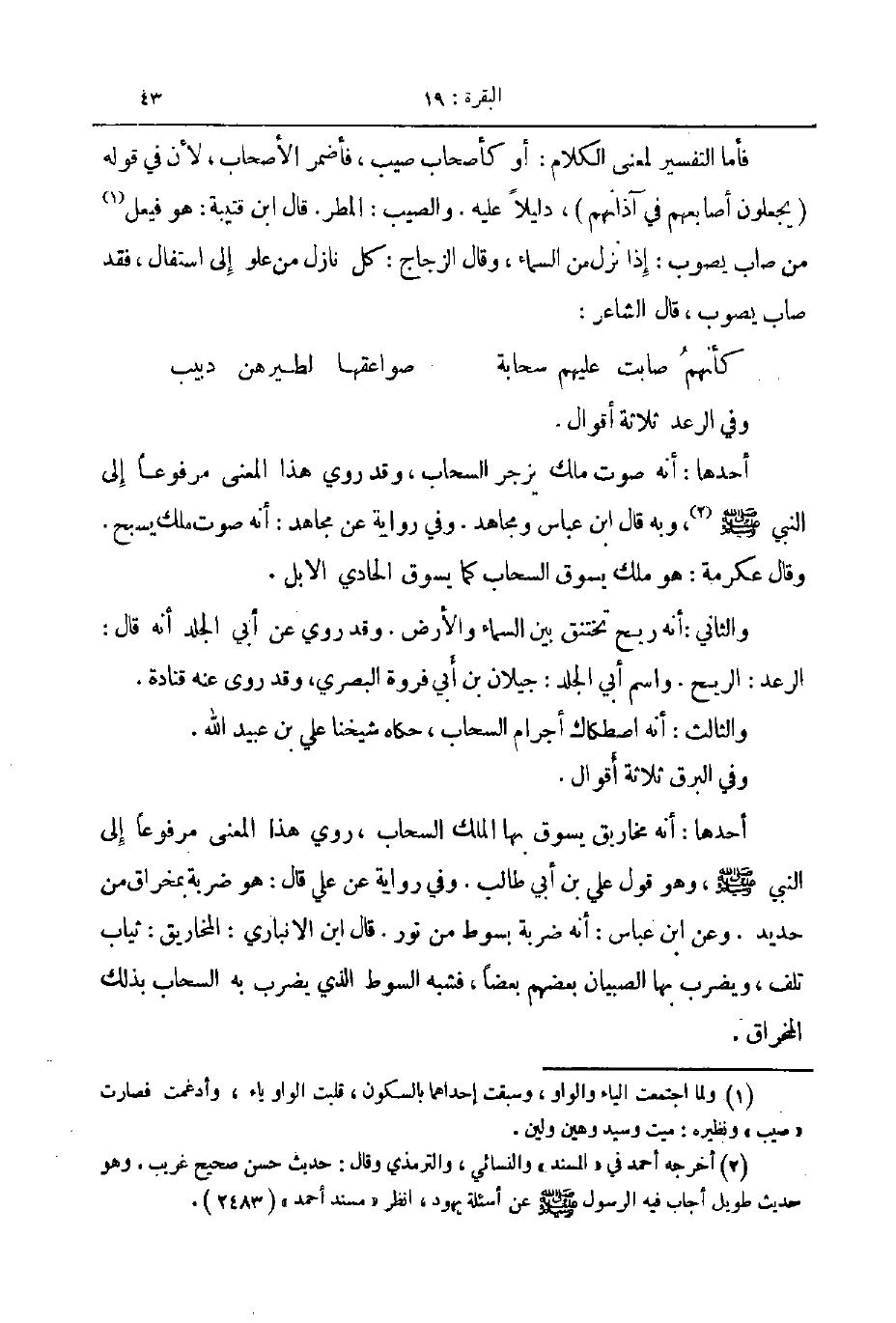 فأما التفسير لمعنى الكلام او كأصحاب صيب فأضمر الأصحاب لأن في قوله يجعلون أصابعهم في آذانهم دليلا عليه والصيب المطر قال ابن قبية هو فيعل من صاب يصوب إذا نزل من السماء وقال الزجاج كل نازل من علو الى استفال فقد صاب يصوب قال الشاعر ... كأنهم صابت عليهم سحابة ... صواعقها لطيرهن دبيب ...