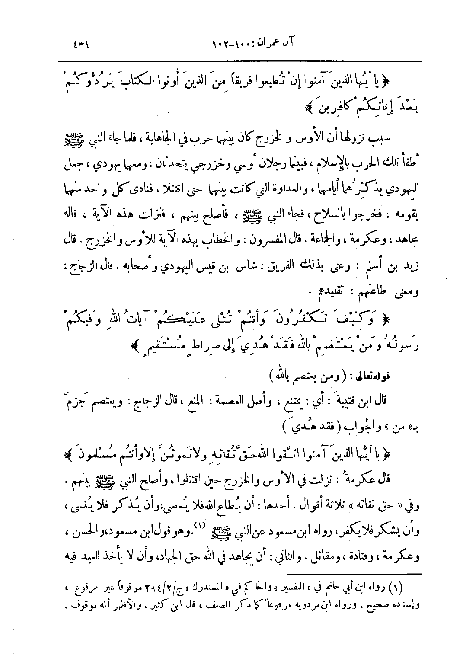 سبب نزولها أن الأوس والخزرج كان بينهما حرب في الجاهلية فلما جاء النبي صلى الله عليه و سلم أطفأ تلك الحرب بالإسلام فبينما رجلان أوسي وخزرجي يتحدثان ومعهما يهودي جعل اليهودي يذكرهما أيامهما والعداوة التي كانت بينهما حتى اقتتلا فنادى كل واحد منهما بقومه فخرجوا بالسلاح فجاء النبي صلى الله عليه و سلم فأصلح بينهم فنزلت هذه الآية قاله مجاهد وعكرمة والجماعة قال المفسرون والخطاب بهذه الآية للأوس والخرزج قال زيد بن أسلم وعنى بذلك الفريق شاس بن قيس اليهودي وأصحابه قال الزجاج ومعنى طاعتهم تقليدهم