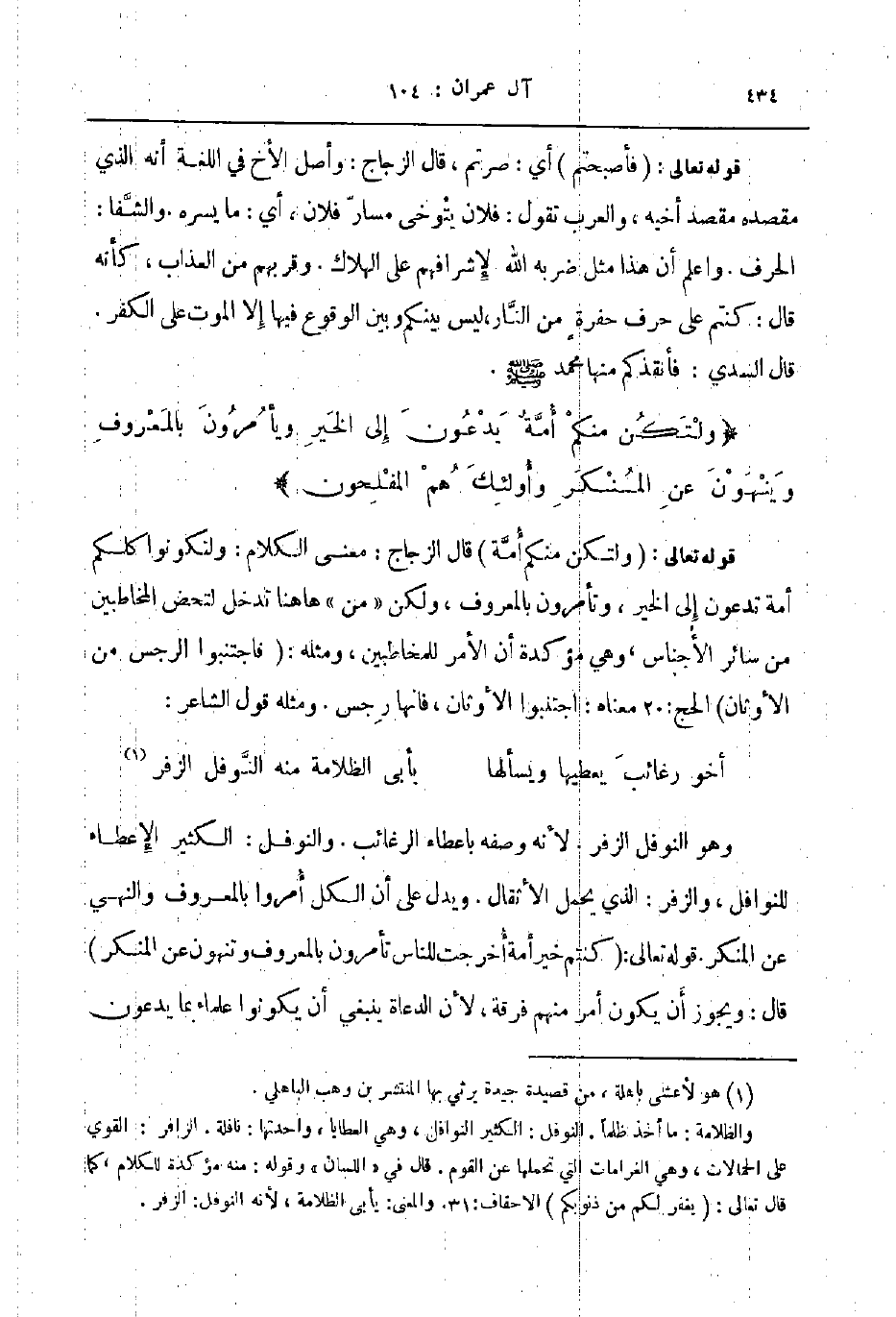 وهو النوفل الزفر لأنه وصفه باعطاء الرغائب والنوفل الكثير الإعطاء للنوافل والزفر الذي يحمل الأثقال ويدل على أن الكل أمروا بالمعروف والنهي عن المنكر قوله تعالى كنتم خير أمة أخرجت للناس تأمرون بالمعروف وتنهون عن المنكر قال ويجوز أن يكون أمر منهم فرقة لأن الدعاة ينبغي أن يكونوا علماء بما يدعون
