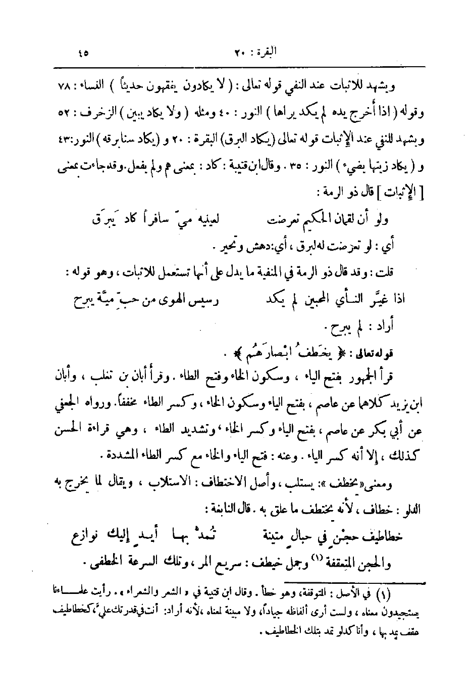 ويشهد للاثبات عند النفي قوله تعالى لا يكادون يفقهون حديثا النساء 87 وقوله إذا أخرج يده لم يكد يراها النور 40 ومثله ولا يكاد يبين الزخرف 52 ويشهد للنفي عند الإثبات قوله تعالى يكاد البرق البقرة 20 و يكاد سنا برقه النور 43 و يكاد زيتها يضئ النور 35 وقال ابن قتيبة كاد بمعنى هم ولم يفعل وقد جاءت بمعنى الإثبات قال ذو الرمة ... ولو أن لقمان الحكيم تعرضت ... لعينيه مي سافرا كاد يبرق ...