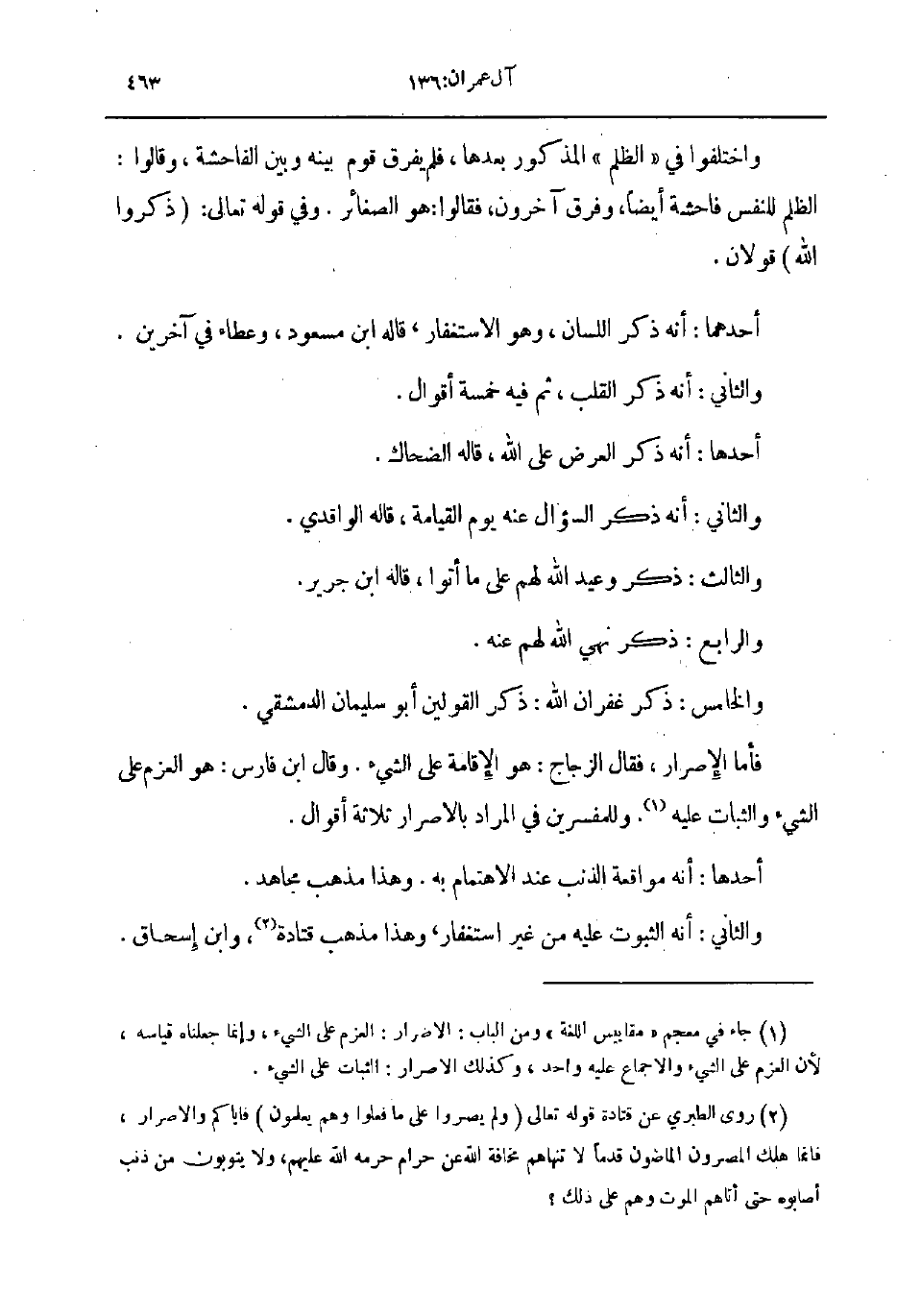فأما الإصرار فقال الزجاج هو الإقامة على الشىء وقال ابن فارس هو العزم على الشىء والثبات عليه وللمفسرين في المراد بالاصرار ثلاثة أقوال
