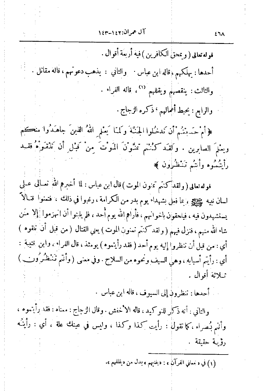 قوله تعالى ولقد كنتم تمنون الموت قال ابن عباس لما أخبرهم الله تعالى على لسان نبيه صلى الله عليه و سلم بما فعل بشهداء يوم بدر من الكرامة رغبوا في ذلك فتمنوا قتالا يستشهدون فيه فيلحقون باخوانهم فأراهم الله يوم أحد فلم يلبثوا أن انهزموا إلا من شاء الله منهم فنزل فيهم ولقد كنتم تمنون الموت يعني القتال من قبل أن تلقوه أي من قبل أن تنظروا إليه يوم أحد فقد رأيتموه يومئذ قال الفراء و ابن قتيبة أي رأيتم أسبابه وهي السيف ونحوه من السلاح وفي معنى و وأنتم تنظرون ثلاثة أقوال