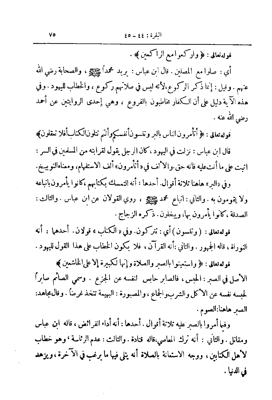 أي صلوا مع المصلين قال ابن عباس يريد محمد صلى الله عليه و سلم والصحابة رضى الله عنهم وقيل إنما ذكر الركوع لأنه ليس في صلاتهم ركوع والخطاب لليهود وفي هذه الآية دليل على أن الكفار مخاطبون بالفروع وهي إحدى الروايتين عن أحمد رضي الله عنه