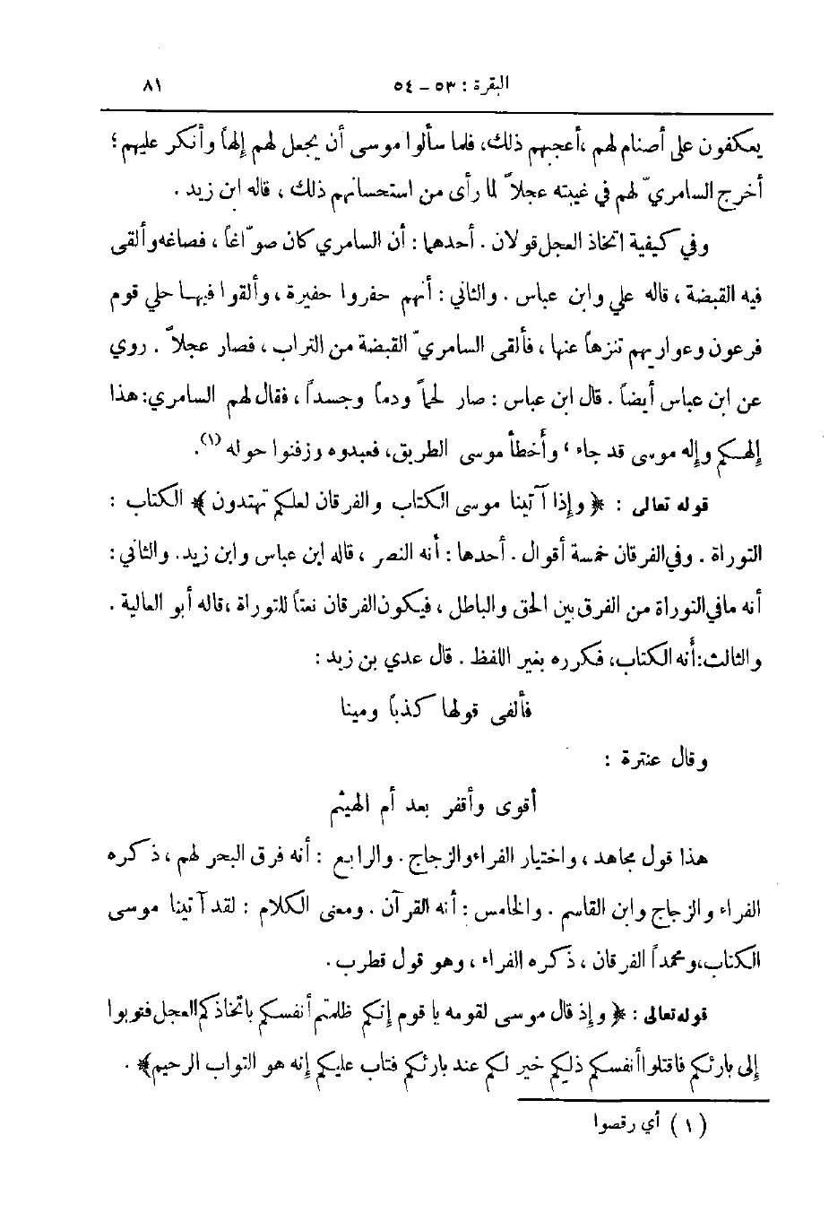 قوله تعالى وإذا آتينا موسى الكتاب والفرقان لعلكم تهتدون الكتاب التوراة وفي الفرقان خمسة أقوال أحدها أنه النصر قاله ابن عباس وابن زيد والثاني أنه ما في التوراة من الفرق بين الحق والباطل فيكون الفرقان نعتا للتوراة قاله أبو العالية والثالث أنه الكتاب فكرره بغير اللفظ قال عدي بن زيد ... فألقى قولها كذبا ومينا ...