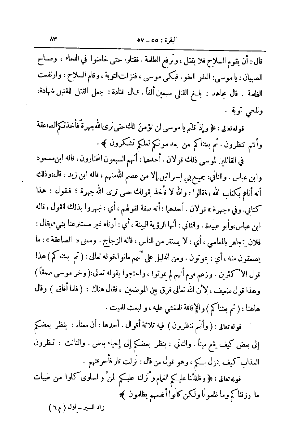 قوله تعالى وإذ قلتم يا موسى لن نؤمن لك حتى نرى الله جهرة فاخذتكم الصاعقة وأنتم تنظرون ثم بعثناكم من بعد موتكم لعلكم تشكرون