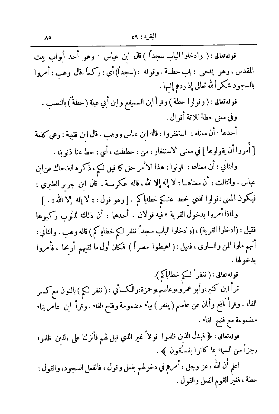 قوله تعالى وادخلوا الباب سجدا قال ابن عباس وهو أحد أبواب بيت المقدس وهو يدعى باب حطة وقوله سجدا أي ركعا قال وهب أمروا بالسجود شكرا لله تعالى إذ ردهم إليها