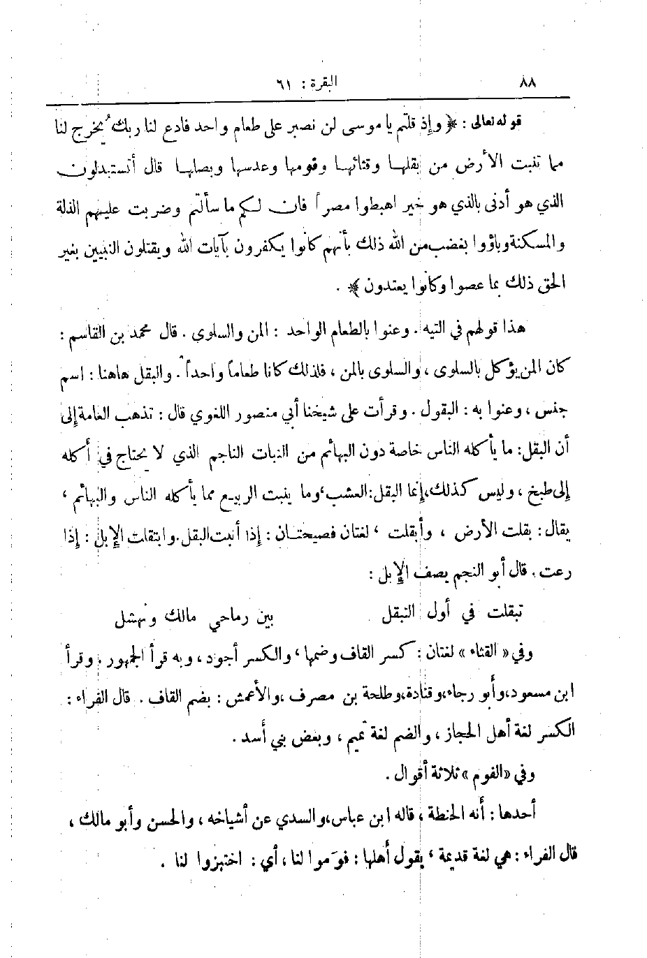 هذا قولهم في التيه وعنوا بالطعام الواحد المن والسلوى قال محمد بن القاسم كان المن يؤكل بالسلوى والسلوى بالمن فلذلك كانا طعاما واحدا والبقل هاهنا اسم جنس وعنوا به البقول وقرأت على شيخنا أبي منصور اللغوي قال تذهب العامة الى أن البقل ما يأكله الناس خاصة دون البهائم من النبات الناجم الذي لايحتاج في أكله الى طبخ وليس كذلك إنما البقل العشب وما ينبت الربيع مما يأكله الناس والبهائم يقال بقلت الارض وأبقلت لغتان فصيحتان إذا أنبت البقل وابتقلت الإبل إذا رعت قال أبو النجم يصف الإبل ... تبقلت في أول التبقل ... وبين رماحي مالك ونهشل ...