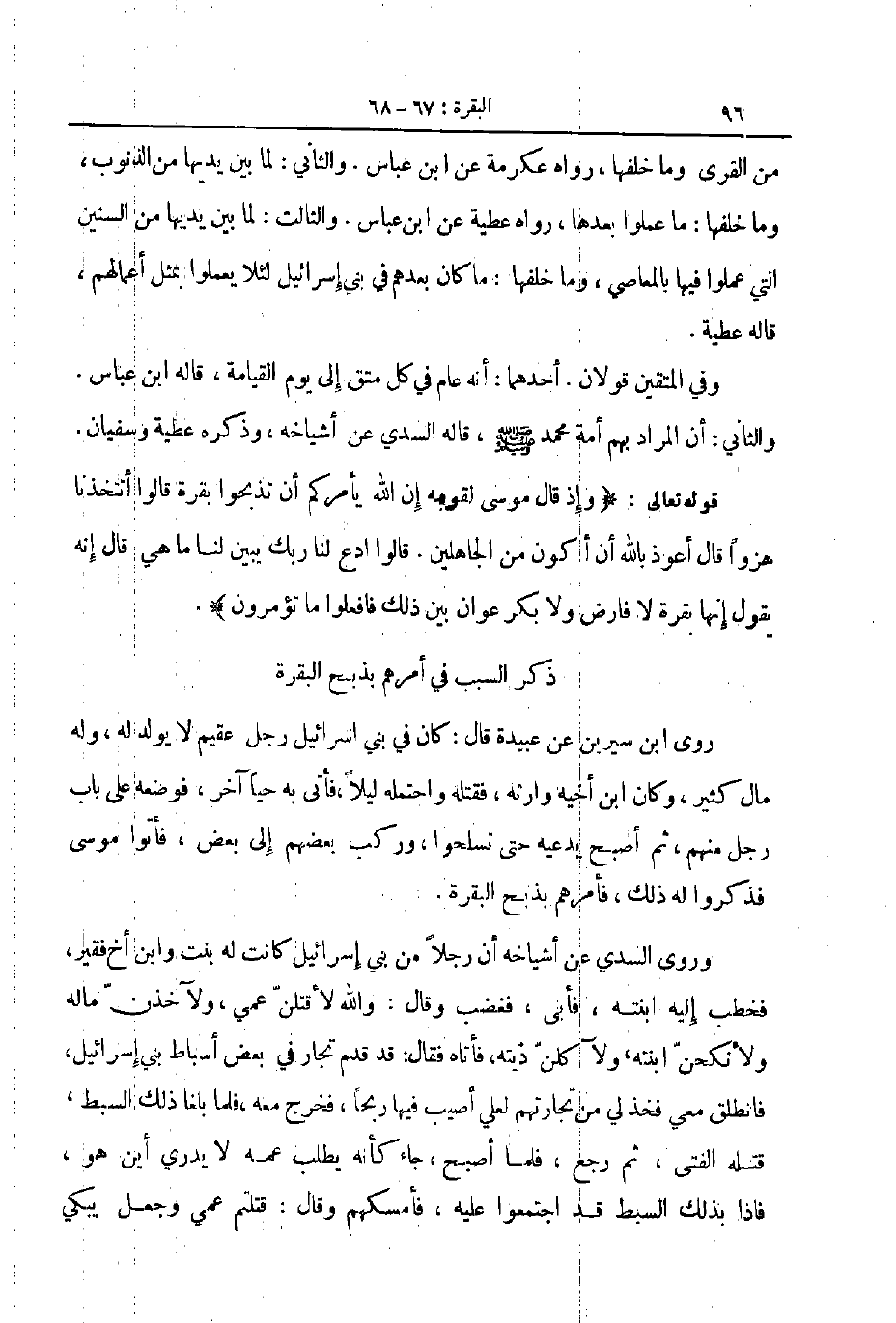 روى ابن سيرين عن عبيدة قال كان في بني اسرائيل رجل عقيم لايولد له وله مال كثير وكان ابن أخيه وارثه فقتله واحتمله ليلا فأتى به حيا آخر فوضعه على باب رجل منهم ثم أصبح يديعه حتى تسلحوا وركب بعضهم الى بعض فأتوا موسى فذكروا له ذلك فأمرهم بذبح البقرة