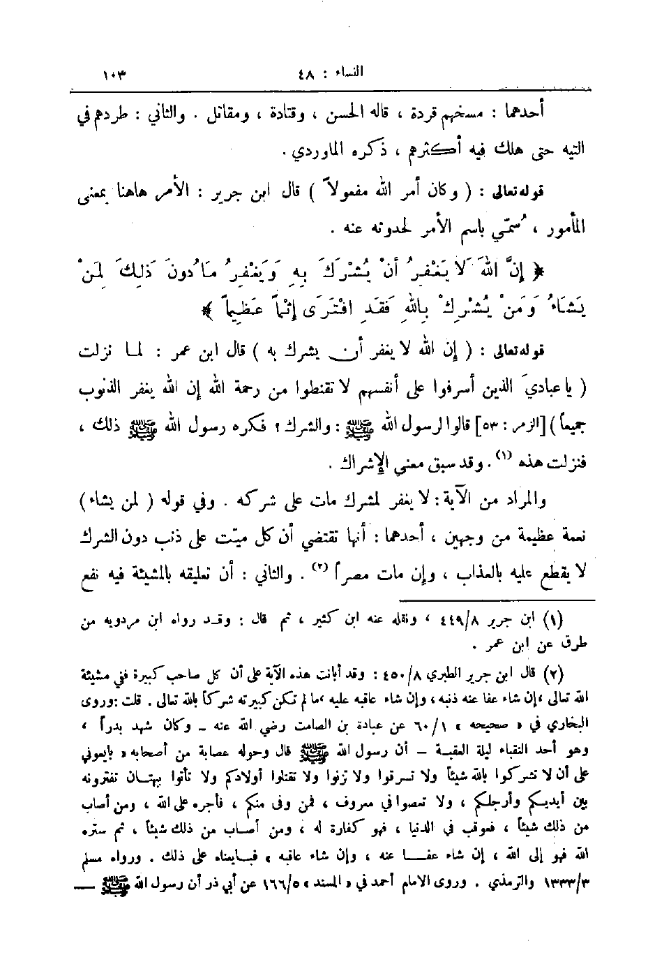 قوله تعالى إن الله لا يغفر أن يشرك به قال ابن عمر لما نزلت يا عبادي الذين أسرفوا على أنفسهم لا تقنطوا من رحمة الله إن الله يغفر الذنوب جميعا الزمر 53 قالوا لرسول الله صلى الله عليه و سلم والشرك فكره رسول الله صلى الله عليه و سلم ذلك فنزلت هذه وقد سبق معنى الإشراك