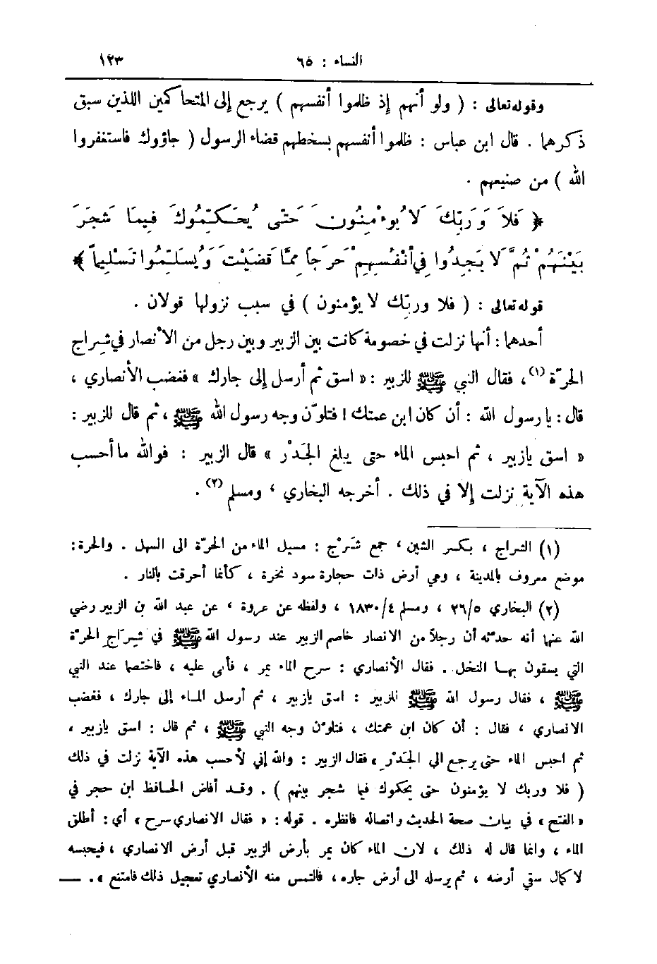 أحدهما أنها نزلت في خصومة كانت بين الزبير وبين رجل من الأنصار في شراج الحرة فقال النبي صلى الله عليه و سلم للزبير اسق ثم أرسل إلى جارك فغضب الأنصار قال يا رسول الله أن كان ابن عمتك فتلون وجه رسول الله صلى الله عليه و سلم ثم قال للزبير اسق يا زبير ثم احبس الماء حتى يبلغ الجدر قال الزبير فوالله ما أحسب هذه الآية نزلت إلى في ذلك أخرجه البخاري ومسلم