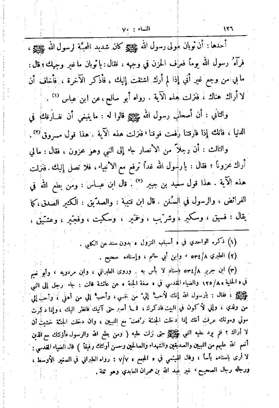 أحدها أن ثوبان مولى رسول الله صلى الله عليه و سلم كان شديد المحبة لرسول الله صلى الله عليه و سلم فرآه رسول الله يوما فعرف الحزن في وجهه فقال يا ثوبان ما غير وجهك قال ما بي من وجع غير أني إذا لم أرك اشتقت إليك فأذكر الآخرة فأخاف أن لا أراك هناك فنزلت هذه الآية رواه أبو صالح عن ابن عباس