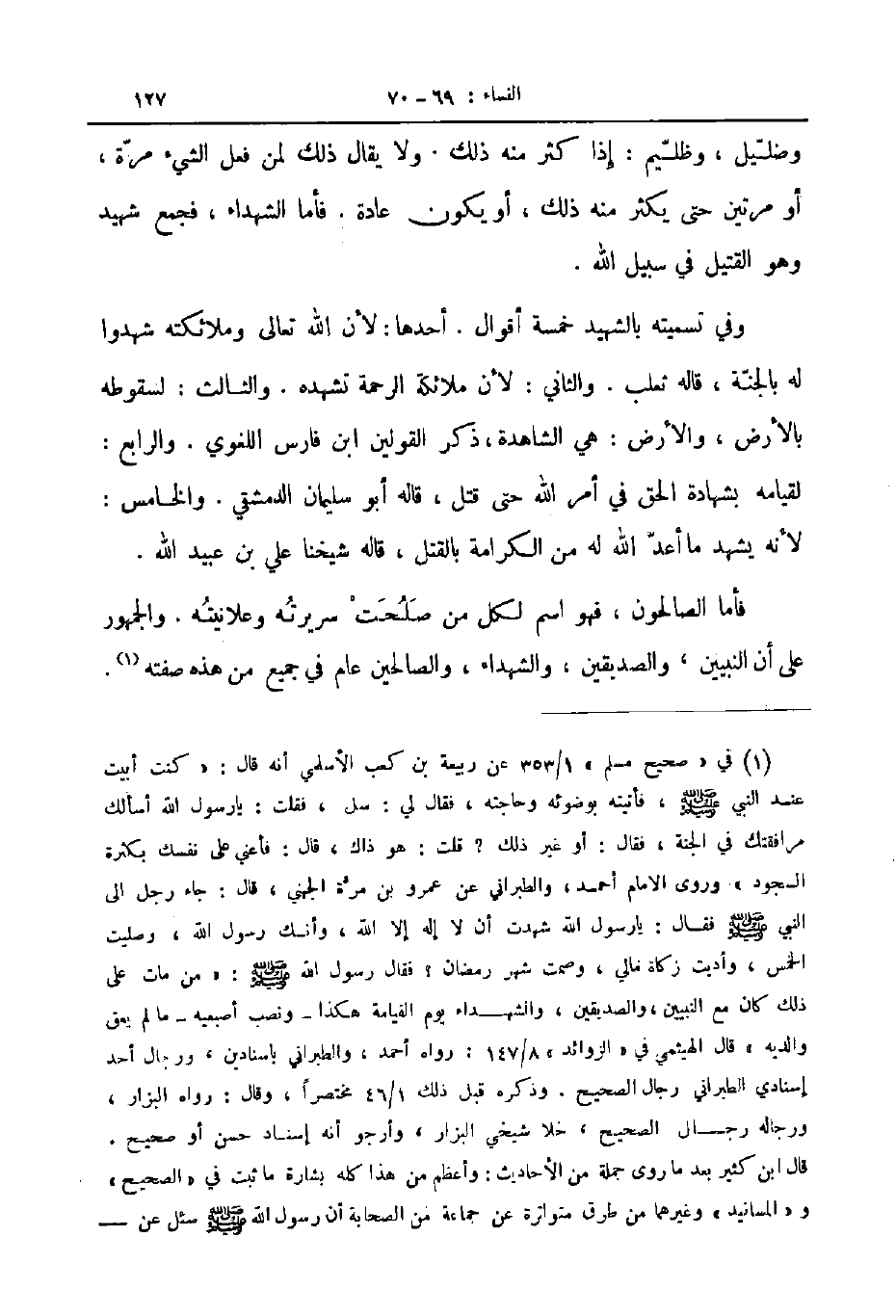 وفي تسميته بالشهيد خمسة أقوال أحدها لأن الله تعالى وملائكته شهدوا له بالجنة قاله ثعلب والثاني لأن ملائكة الرحمة تشهده والثالث لسقوطه بالأرض والأرض هي الشاهدة ذكر القولين ابن فارس اللغوي والرابع لقيامه بشهادة الحق في أمر الله حتى قتل قاله أبو سليمان الدمشقي والخامس لأنه يشهد ما أعد الله له من الكرامة بالقتل قاله شيخنا على بن عبيد الله