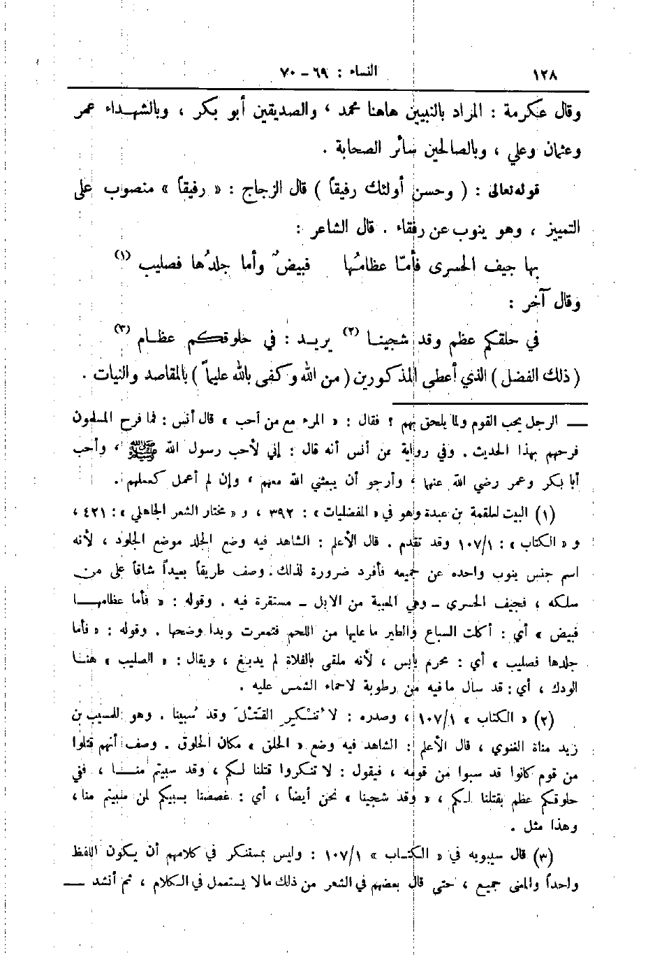 قوله تعالى وحسن أولئك رفيقا قال الزجاج رفيقا منصوب على التمييز وهو ينوب عن رفقاء قال الشاعر ... بها جيف الحسرى فأما عظامها ... فبيض وأما جلدها فصليب ...