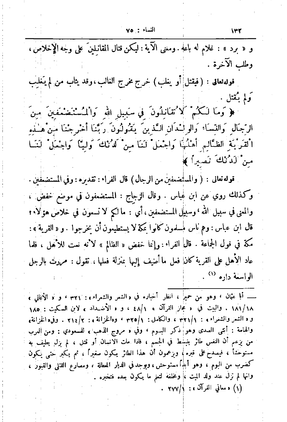 قوله تعالى والمستضعفين من الرجال قال الفراء تقديره وفي المستضعفين وكذلك روي عن ابن عباس وقال الزجاج المستضعفون في موضع خفض والمعنى في سبيل الله وسبيل المستضعفين أي ما لكم لا تسعون في خلاص هؤلاء قال ابن عباس وهم ناس مسلمون كانوا بمكة لا يستطيعون أن يخرجوا والقرية مكة في قول الجماعة قال الفراء وإنما خفض الظالم لأنه نعت للأهل فلما عاد الأهل على القرية كان فعل ما أضيف إليها بمنزلة فعلها تقول مررت بالرجل الواسعة داره