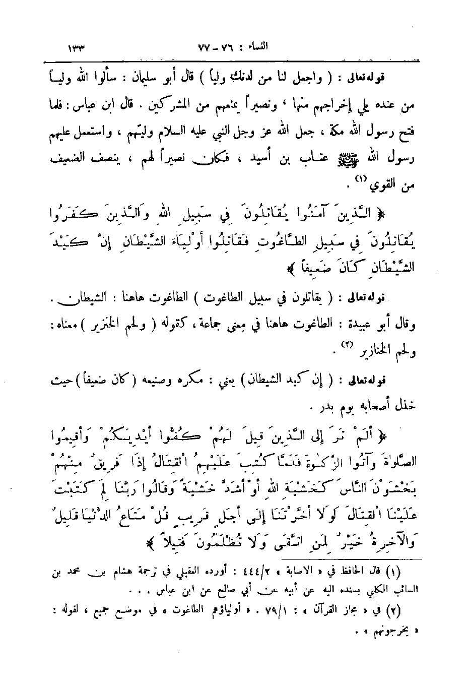قوله تعالى واجعل لنا من لدنك وليا قال أبو سليمان سألوا الله وليا من عنده يلي إخراجهم منها ونصيرا يمنعهم من المشركين قال ابن عباس فلما فتح رسول الله مكة جعل الله عز و جل النبي عليه السلام وليهم واستعمل عليهم رسول الله صلى الله عليه و سلم عتاب بن أسيد فكان نصيرا لهم ينصف الضعيف من القوي الذين آمنوا يقاتلون في سبيل الله والذين كفروا يقاتلون في سبيل الطاغوت فقاتلوا أولياء الشيطان إن كيد الشيطان كان ضعيفا