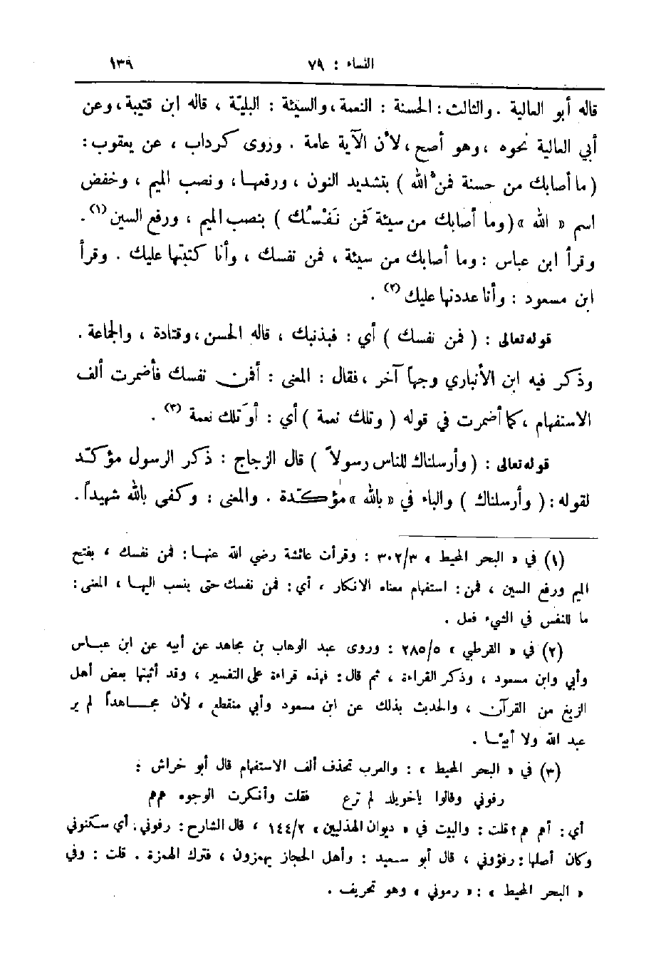 قاله أبو العالية والثالث الحسنة النعمة والسيئة البلية قاله ابن قتيبة وعن أبي العالية نحوه وهو أصح لأن الآية عامة وروى كرداب عن يعقوب ما أصابك من حسنة فمن الله بتشديد النون ورفعها ونصب الميم وخفض اسم الله وما أصابك من سيئة فمن نفسك بنصب الميم ورفع السين