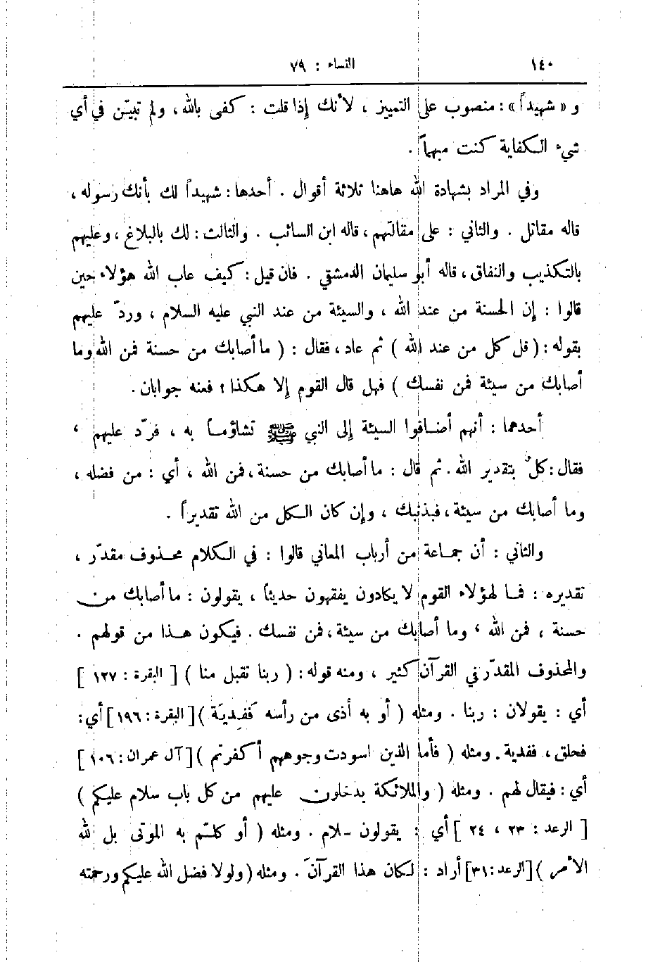 والثاني أن جماعة من أرباب المعاني قالوا في الكلام محذوف مقدر تقديره فما لهؤلاء القوم لا يكادون يفقهون حديثا يقولون ما أصابك من حسنة فمن الله وما أصابك من سيئة فمن نفسك فيكون هذا من قولهم والمحذوف المقدر في القرآن كثير ومنه قوله ربنا تقبل منا البقرة 127 أي يقولان ربنا ومثله أو به أذى من رأسه ففدية البقرة 196 أي فحلق ففدية ومثله فأما الذين اسودت وجههم أكفرتم آل عمران 106 أي فيقال لهم ومثله والملائكة يدخلون عليهم من كل باب سلام عليكم الرعد 23 24 أي يقولون سلام ومثله أو كلم به الموتى بل لله الأمر الرعد 31 أراد لكان هذا القرآن ومثله ولولا فضل الله عليكم ورحمته