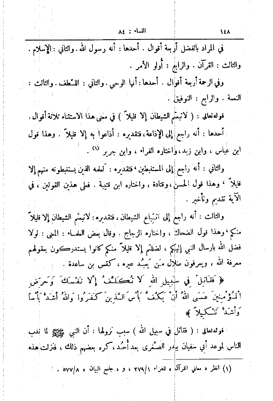 والثالث أنه راجع إلى اتباع الشيطان فتقديره لاتبعتم الشيطان إلا قليلا منكم وهذا قول الضحاك واختاره الزجاج وقال بعض العلماء المعنى لولا فضل الله بارسال النبي إليكم لضللتم إلا قليلا منكم كانوا يستدركون بعقولهم معرفة الله ويعرفون ضلال من يعبد غيره كقس بن ساعدة فقاتل في سبيل الله لا تكلف إلا نفسك وحرض المؤمنين عسى الله أن يكف بأس الذين كفروا والله أشد بأسا وأشد تنكيلا