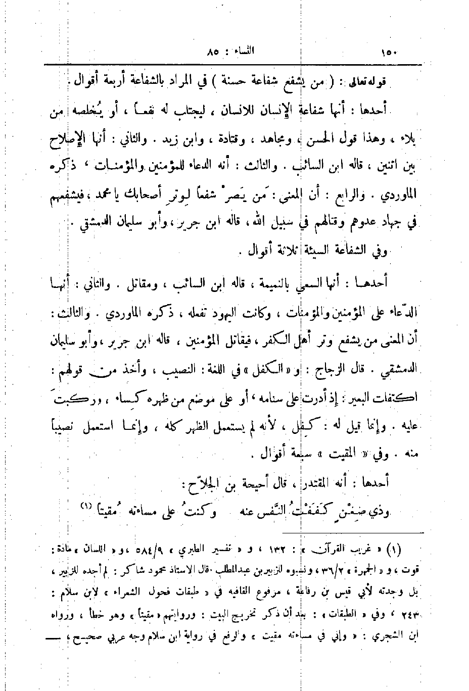 أحدها أنها شفاعة الإنسان للانسان ليجتلب له نفعا أو يخلصه من بلاء وهذا قول الحسن ومجاهد وقتادة وابن زيد والثاني أنها الإصلاح بين اثنين قاله ابن السائب والثالث أنه الدعاء للمؤمنين والمؤمنات ذكره الماوردي والرابع أن المعنى من يصر شفعا لوتر أصحابك يا محمد فيشفعهم في جهاد عدوهم وقتالهم في سبيل الله قاله ابن جرير وأبو سليمان الدمشقي