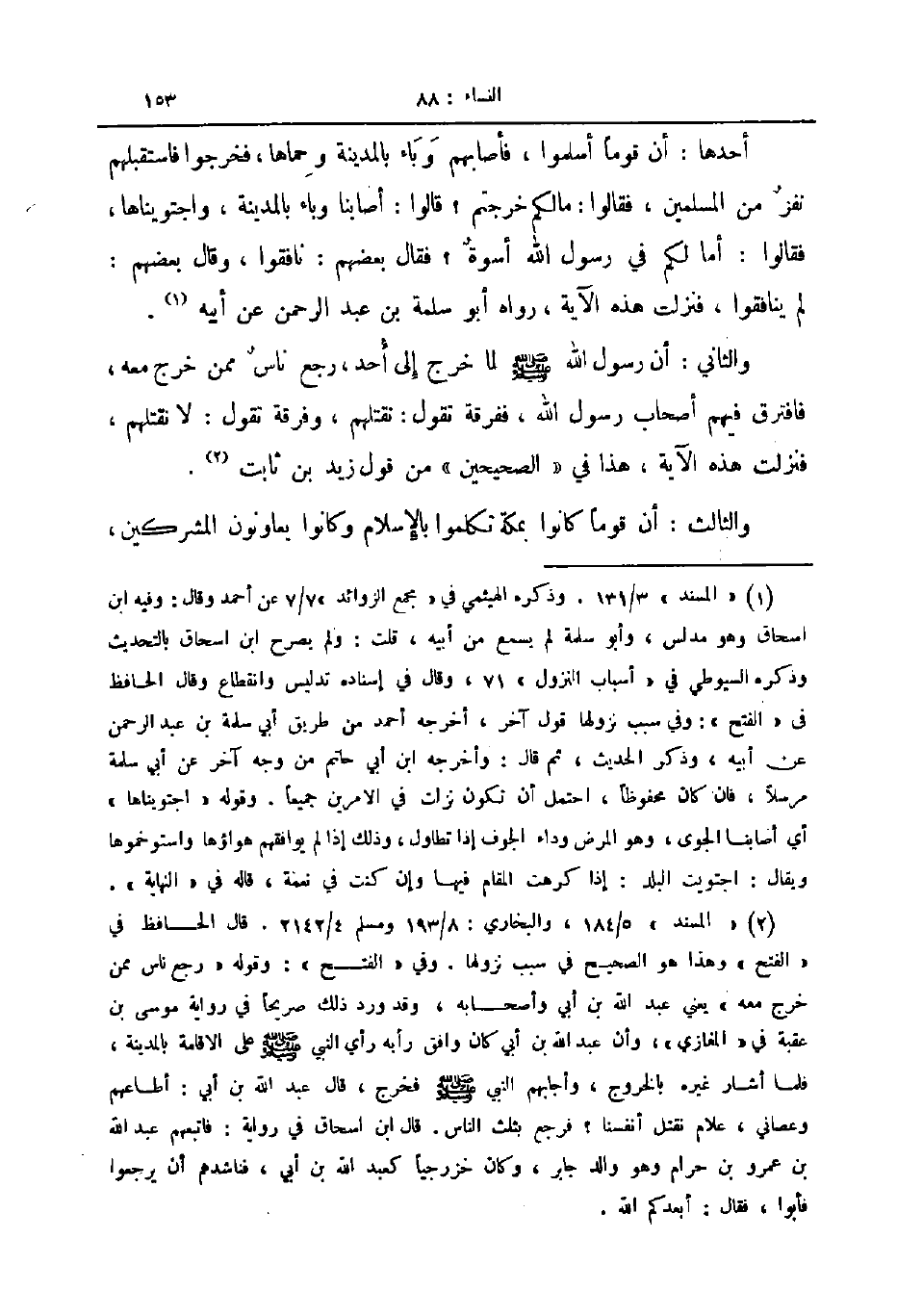 والثاني أن رسول الله صلى الله عليه و سلم لما خرج إلى أحد رجع ناس ممن خرج معه فافترق فيهم أصحاب رسول الله ففرقة تقول نقتلهم وفرقة تقول لا نقتلهم فنزلت هذه الآية هذا في الصحيحين من قول زيد بن ثابت