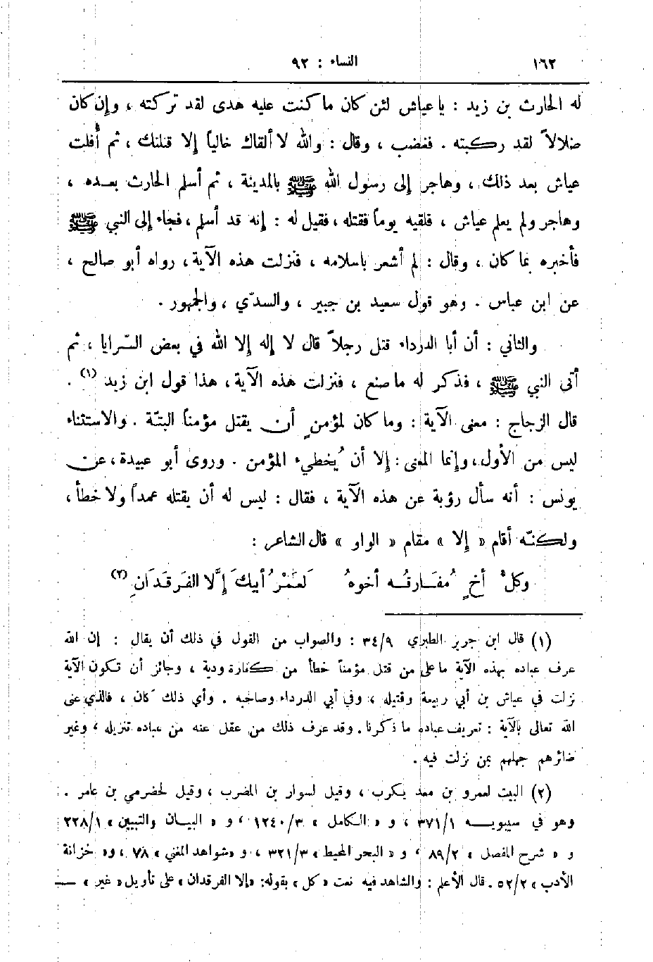 له الحارث بن زيد يا عياش لئن كان ما كنت عليه هدى لقد تركته وإن كان ضلالا لقد ركبته فغضب وقال والله لا ألقاك خاليا إلا قتلتك ثم أفلت عياش بعد ذلك وهاجر إلى رسول الله صلى الله عليه و سلم بالمدينة ثم أسلم الحارث بعده وهاجر ولم يعلم عياش فلقيه يوما فقتله فقيل له إنه قد أسلم فجاء إلى النبي صلى الله عليه و سلم فأخبره بما كان وقال لم أشعر باسلامه فنزلت هذه الآية رواه أبو صالح عن ابن عباس وهو قول سعيد بن جبير والسدي والجمهور
