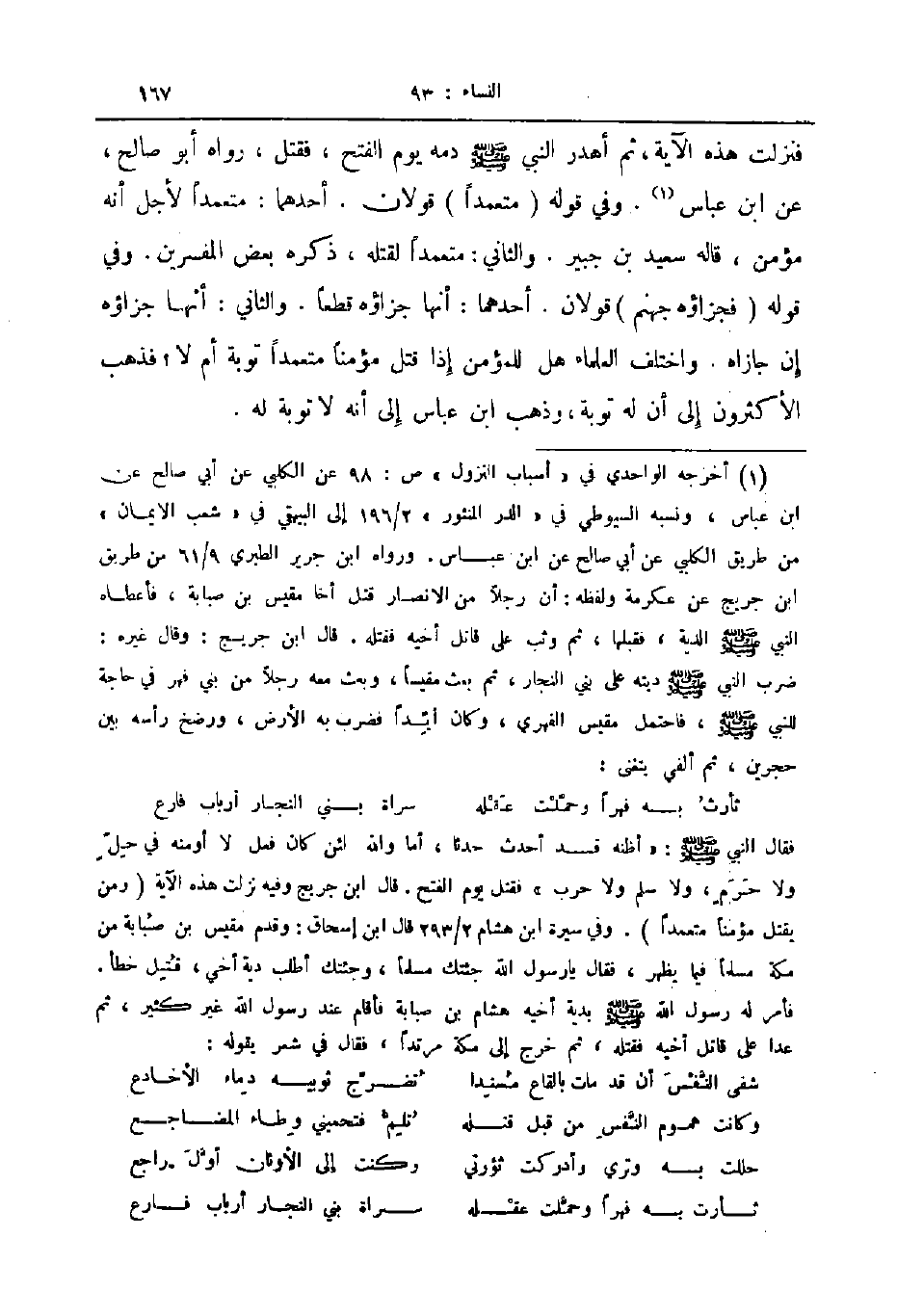 فنزلت هذه الآية ثم أهدر النبي صلى الله عليه و سلم دمه يوم الفتح فقتل رواه أبو صالح عن ابن عباس وفي قوله متعمدا قولان أحدهما متعمدا لأجل أنه مؤمن قاله سعيد بن جبير والثاني متعمدا لقتله ذكره بعض المفسرين وفي قوله فجزاؤه جهنم قولان أحدهما أنها جزاؤه قطعا والثاني أنها جزاؤه إن جازاه واختلف العلماء هل للمؤمن إذا قتل مؤمنا متعمدا توبة أم لا فذهب الأكثرون إلى أن له توبة وذهب ابن عباس إلى أنه لا توبة له
