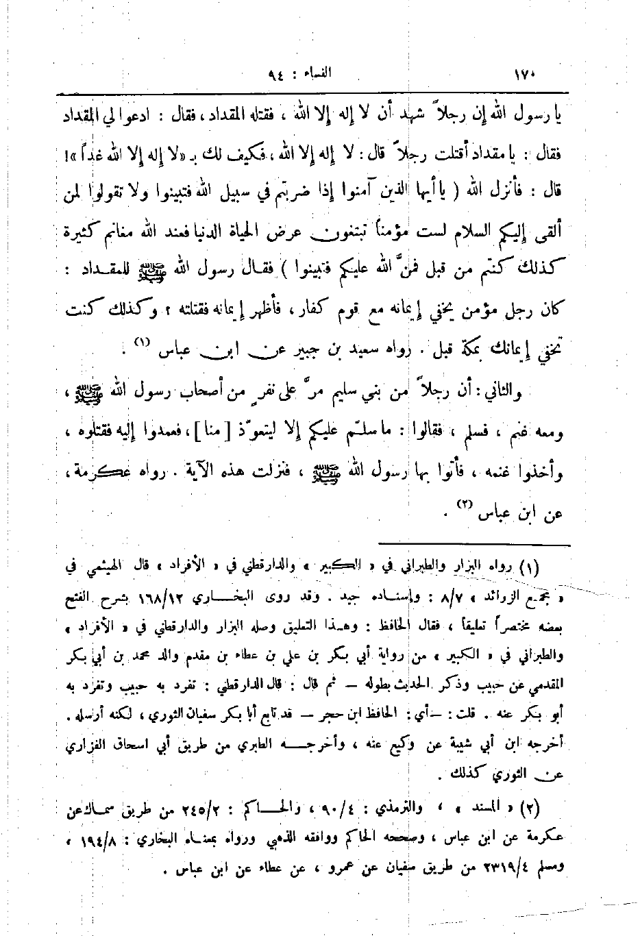 قال فأنزل الله يا أيها الذين آمنوا إذا ضربتم في سبيل الله فتبينوا ولا تقولوا لمن ألقى إليكم السلام لست مؤمنا تبتغون عرض الحياة الدنيا فعند الله مغانم كثيرة كذلك كنتم من قبل فمن الله عليكم فتبينوا فقال رسول الله صلى الله عليه و سلم للمقداد كان رجل مؤمن يخفي إيمانه مع قوم كفار فأظهر إيمانه فقتلته وكذلك كنت تخفي إيمانك بمكة قبل رواه سعيد بن جبير عن ابن عباس