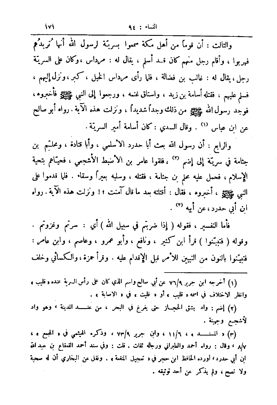 والرابع أن رسول الله بعث أبا حدرد الأسلمي وأبا قتادة ومحلم بن جثامة في سرية إلى إضم فلقوا عامر بن الأضبط الأشجعي فحياهم بتحية الإسلام فحمل عليه محلم بن جثامة فقتله وسلبه بعيرا وسقاء فلما قدموا على النبي صلى الله عليه و سلم أخبروه فقال أقتلته بعد ما قال آمنت ونزلت هذه الآية رواه ابن أبي حدرد عن أبيه