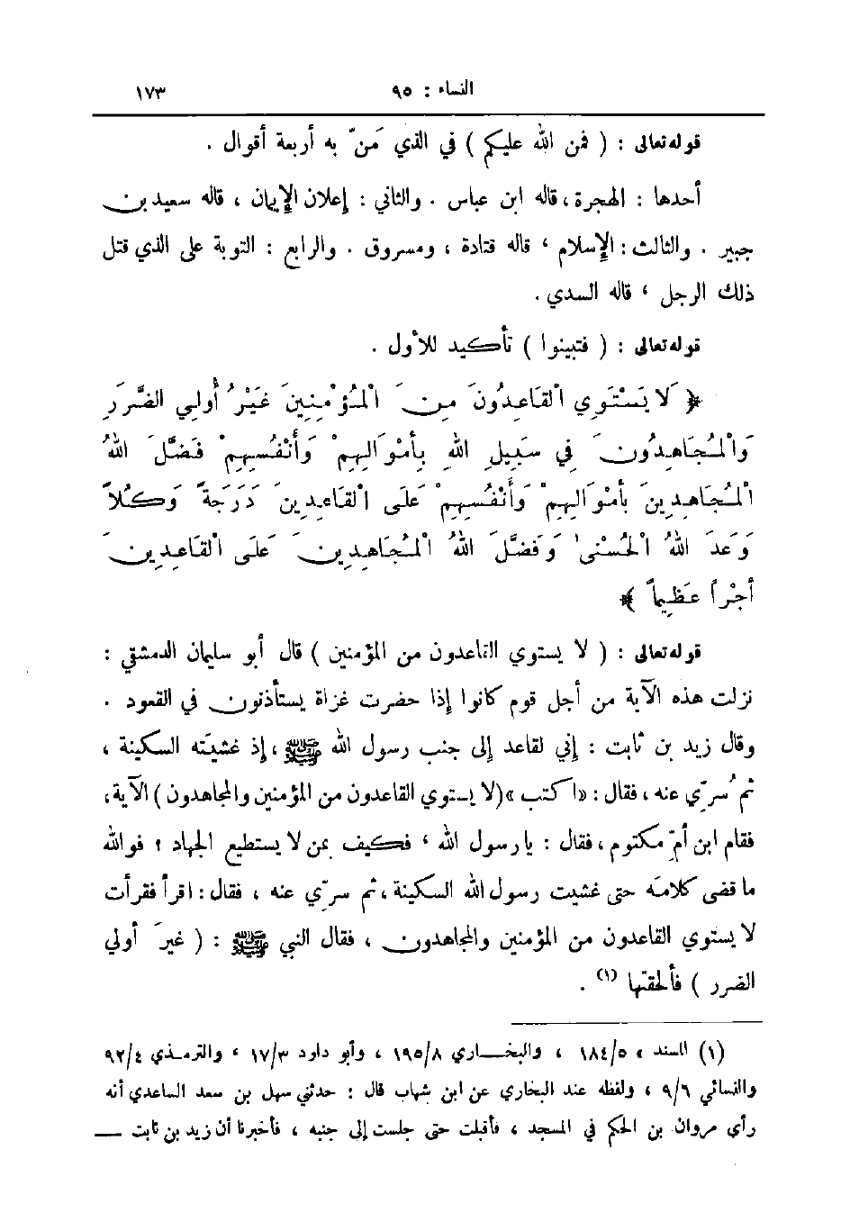 قوله تعالى فتبينوا تأكيد للأول لا يستوي القاعدون من المؤمنين غير أولي الضرر والمجاهدون في سبيل الله بأموالهم وأنفسهم فضل الله المجاهدين بأموالهم وأنفسهم على القاعدين درجة وكلا وعد الله الحسنى وفضل الله المجاهدين على القاعدين أجرا عظيما
