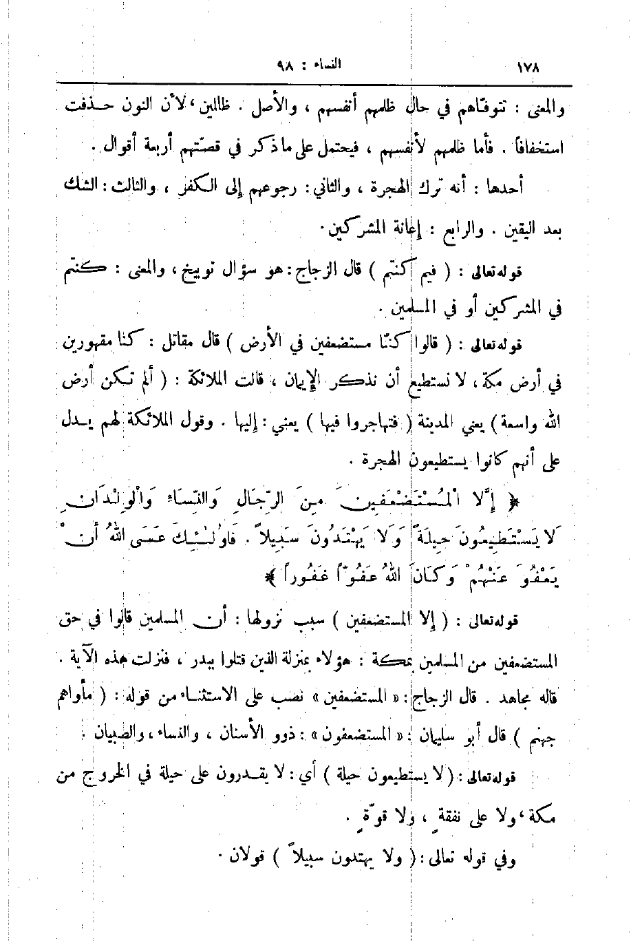 قوله تعالى قالوا كنا مستضعفين في الأرض قال مقاتل كنا مقهورين في أرض مكة لا نستطيع أن نذكر الإيمان قالت الملائكة ألم تكن أرض الله واسعة يعني المدينة فتهاجروا فيها يعني إليها وقول الملائكة لهم يدل على أنهم كانوا يستطيعون الهجرة إلا المستضعفين من الرجال والنساء والولدان لا يستطيعون حيلة ولا يهتدون سبيلا فاولئك عسى الله أن يعفو عنهم وكان الله عفوا غفورا