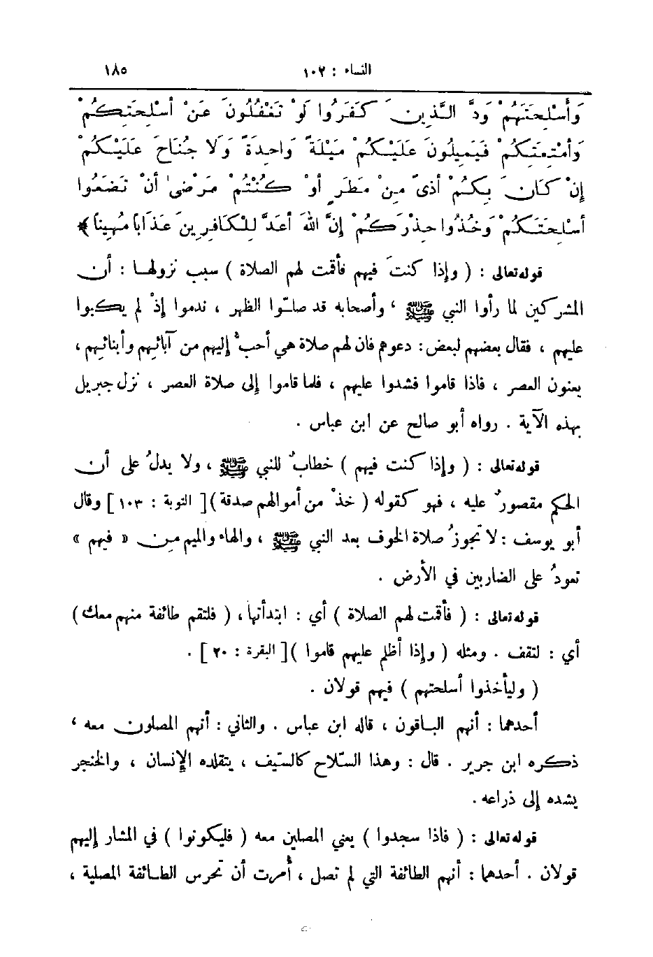 قوله تعالى وإذا كنت فيهم خطاب للنبي صلى الله عليه و سلم ولا يدل على أن الحكم مقصور عليه فهو كقوله خذ من أموالهم صدقة التوبة 103 وقال أبو يوسف لا تجوز صلاة الخوف بعد النبي صلى الله عليه و سلم والهاء والميم من فيهم تعود على الضاربين في الأرض