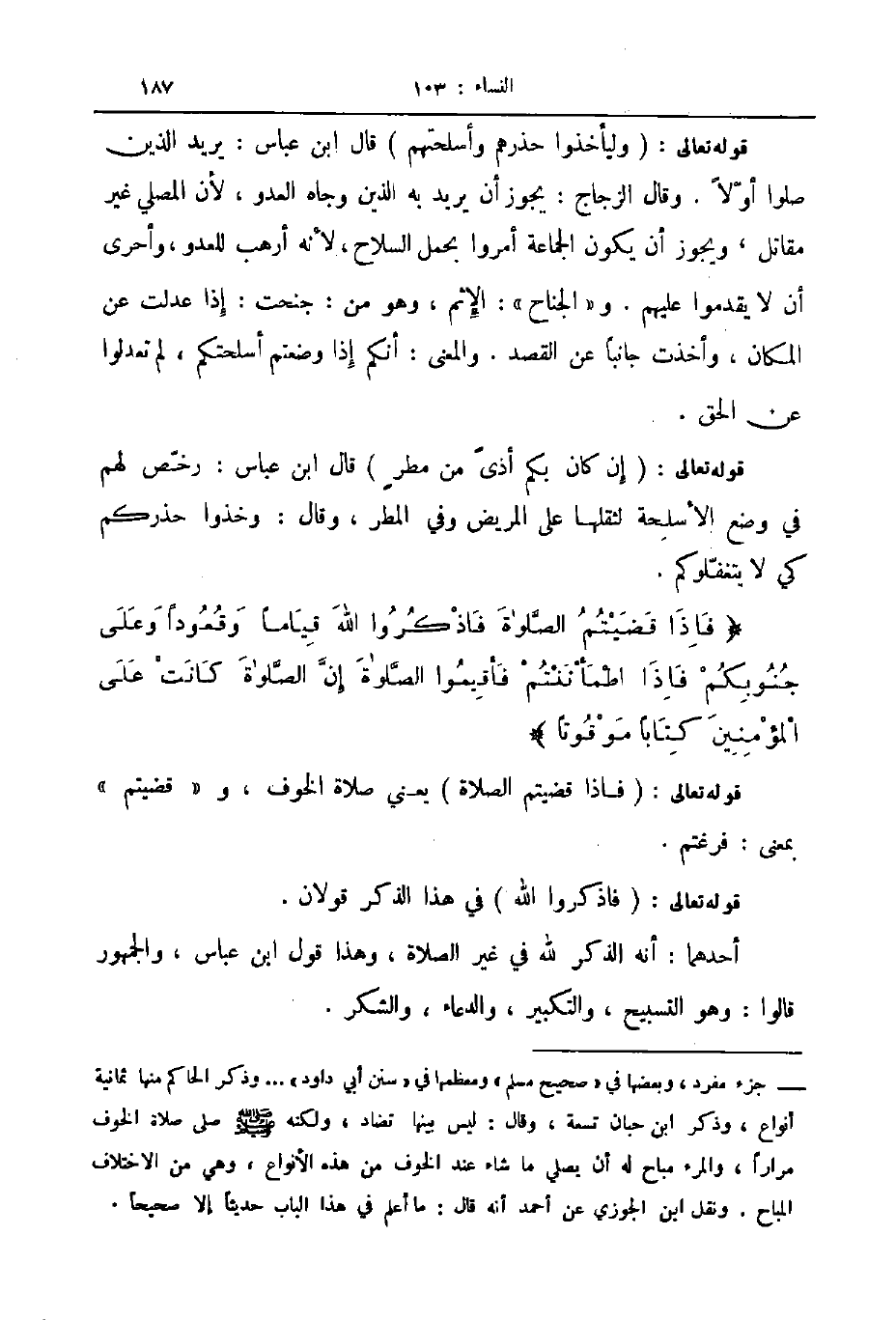 قوله تعالى إن كان بكم أذى من مطر قال ابن عباس رخص لهم في وضع الأسلحة لثقلها على المريض وفي المطر وقال خذوا حذركم كي لا يتغفلوكم فاذا قضيتم الصلوة فاذكروا الله قياما وقعودا وعلى جنوبكم فاذا اطمأننتم فأقيموا الصلوة إن الصلوة كانت على المؤمنين كتابا موقوتا