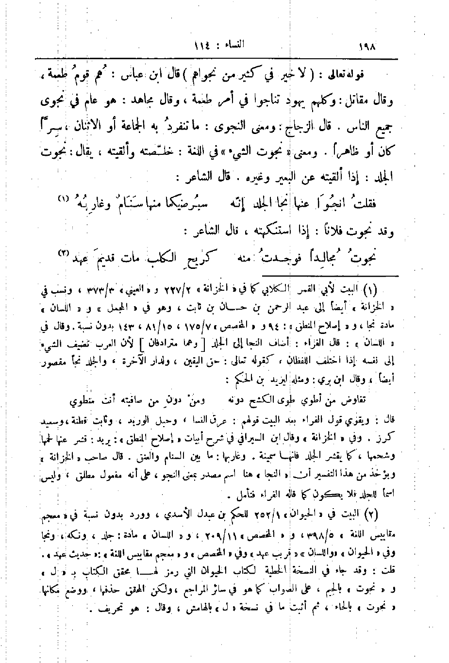 قوله تعالى لا خير في كثير من نجواهم قال ابن عباس هم قوم طعمة وقال مقاتل وكلهم يهود تناجوا في أمر طعمة وقال مجاهد هو عام في نجوى جميع الناس قال الزجاج ومعنى النجوى ما تنفرد به الجماعة أو الاثنان سرا كان أو ظاهرا ومعنى نجوت الشيء في اللغة خلصته وألقيته يقال نجوت الجلد إذا ألقيته عن البعير وغيره قال الشاعر ... فقلت انجوا عنها نجا الجلد إنه ... سيرضيكما منها سنام وغاربه ...