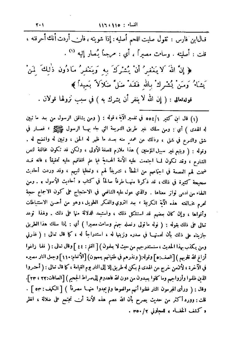 قال ابن فارس تقول صليت اللحم أصليه إذا شويته فان أردت أنك أحرقته قلت أصليته وساءت مصيرا أي مرجعا يصار إليه إن الله لا يغفر أن يشرك به ويغفر ما دون ذلك لمن يشاء ومن يشرك بالله فقد ضل ضلالا بعيدا
