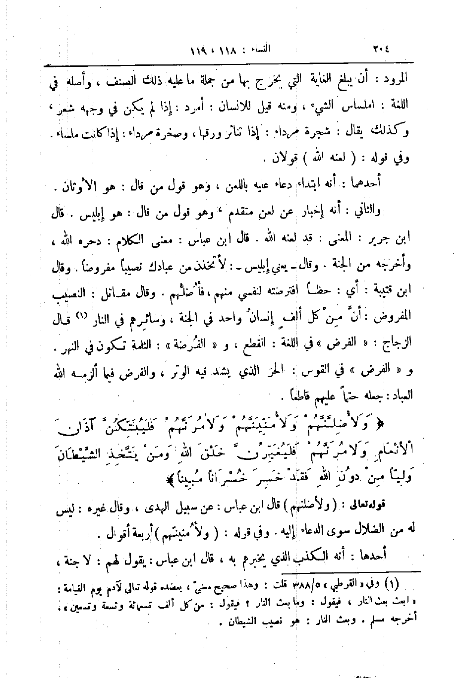 والثاني أنه إخبار عن لعن متقدم وهو قول من قال هو إبليس قال ابن جرير المعنى قد لعنه الله قاله ابن عباس معنى الكلام دحره الله وأخرجه من الجنة وقال يعني إبليس لأتخذن من عبادك نصيبا مفروضا وقال ابن قتيبة اي حظا افترضته لنفسي منهم فأضلهم وقال مقاتل النصيب المفروض أن من كل ألف إنسان واحد في الجنة وسائرهم في النار قال الزجاج الفرض في اللغة القطع والفرضة الثلمة تكون في النهر والفرض في القوس الحز الذي يشد فيه الوتر والفرض فيما ألزمه الله العباد جعله حتما عليهم قاطعا