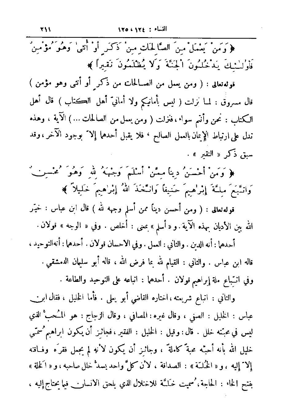 قوله تعالى ومن يعمل من الصالحات من ذكر أو أنثى وهو مؤمن قال مسروق لما نزلت ليس بأمانيكم ولا أماني أهل الكتاب قال أهل الكتاب نحن وأنتم سواء فنزلت ومن يعمل من الصالحات الآية وهذه تدل على ارتباط الإيمان بالعمل الصالح فلا يقبل أحدهما إلا بوجود الآخر وقد سبق ذكر النقير ومن أحسن دينا ممن أسلم وجهه لله وهو محسن واتبع ملة إبراهيم حنيفا واتخذ الله إبراهيم خليلا
