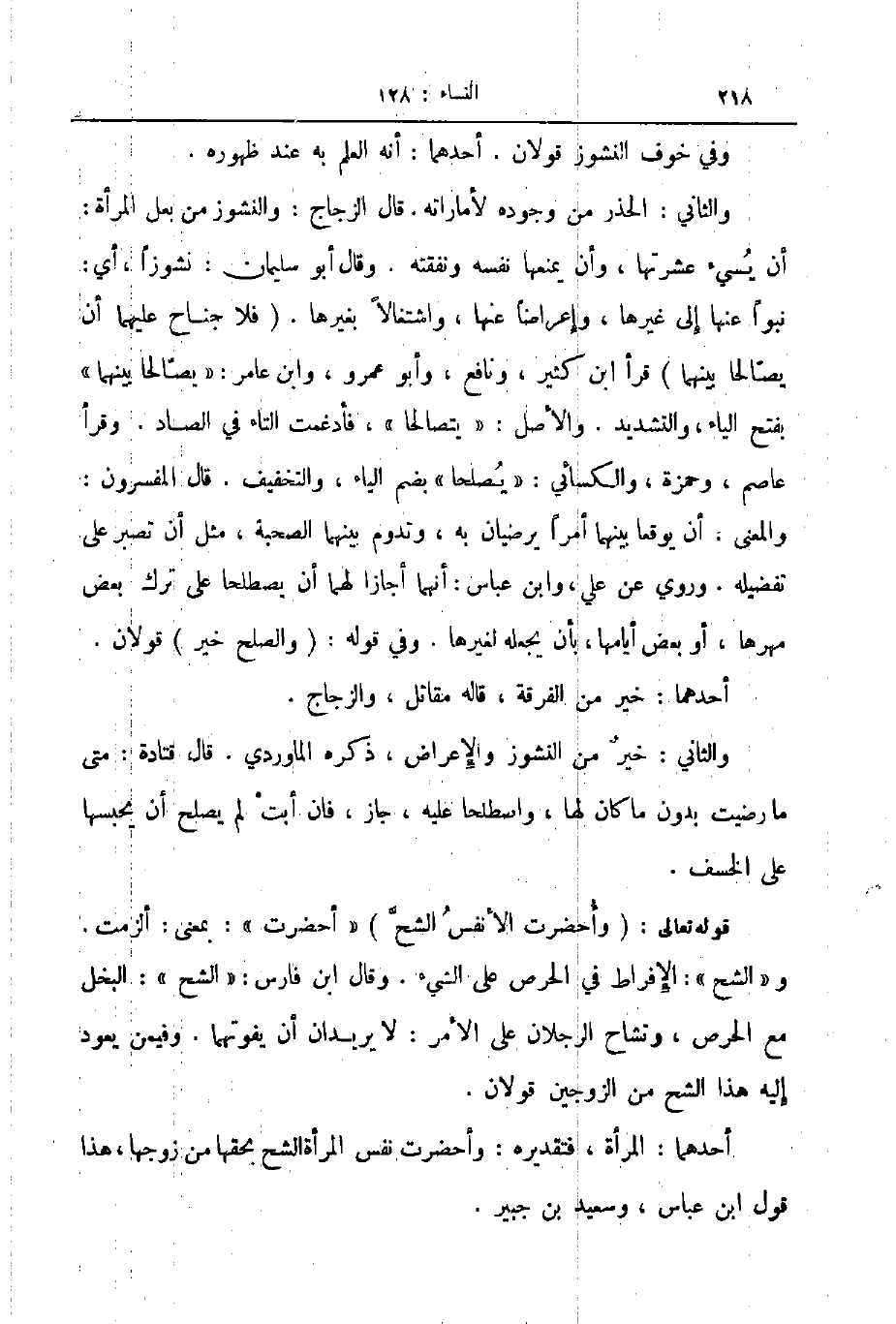 والثاني الحذر من وجوده لأماراته قال الزجاج والنشوز من بعل المرأة أن يسيء عشرتها وأن يمنعها نفسه ونفقته وقال أبو سليمان نشوزا أي نبوا عنها إلى غيرها وإعراضا عنها واشتغالا بغيرها فلا جناحا عليهما أن يصلحا بينهما قرأ ابن كثير ونافع وأبو عمرو وابن عامر يصالحا بينهما بفتح الياء والتشديد والأصل يتصالحا فأدغمت التاء في الصاد وقرأ عاصم وحمزة والكسائي يصلحا بضم الياء والتخفيف قال المفسرون والمعنى أن يوقعا بينهما أمرا يرضيان به وتدوم بينهم الصحبة مثل أن تصبر على تفضيله وروي عن علي وابن عباس أنهما أجازا لهما أن يصطلحا على ترك بعض مهرها أو بعض أيامها بأن يجعله لغيرها وفي قوله والصلح خير قولان