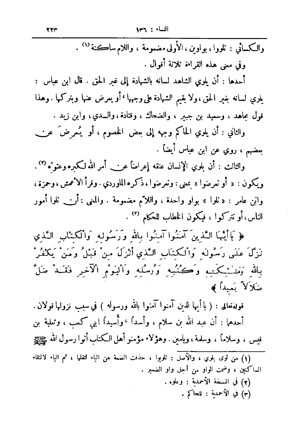 ويكون أو تعرضوا بمعنى وتعرضوا ذكره الماوردي وقرأ الأعمش وحمزة وابن عامر تلوا بواو واحدة واللام مضمومة والمعنى أن تلوا أمور الناس أو تتركوا فيكون الخطاب للحكام يا أيها الذين آمنوا آمنوا بالله ورسوله والكتاب الذي نزل على رسوله والكتاب الذي أنزل من قبل ومن يكفر بالله وملئكته وكتبه ورسله واليوم الآخر فقد ضل ضلالا بعيدا