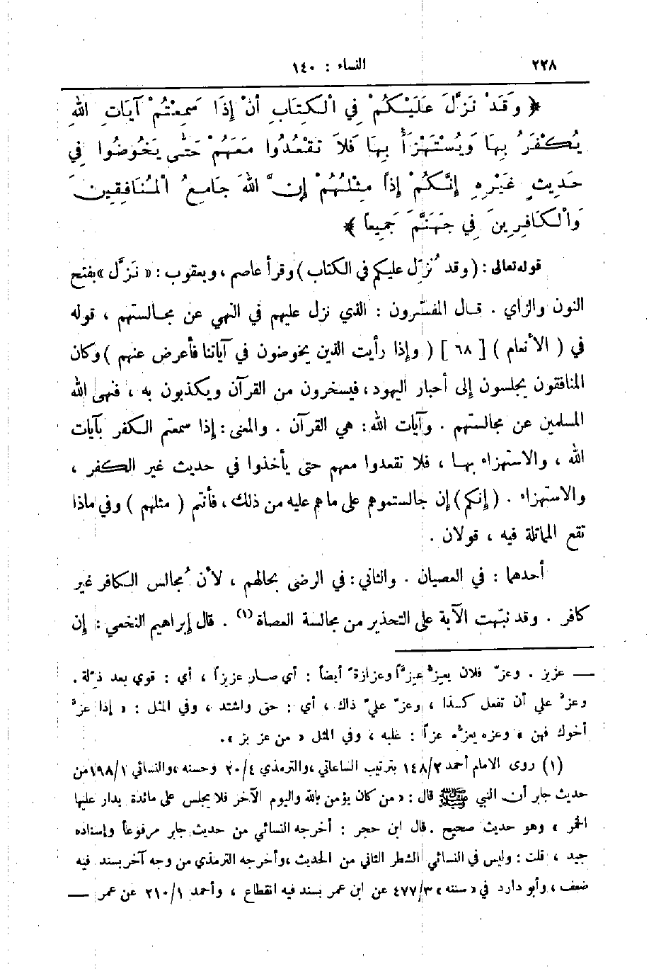 وقد نزل عليكم في الكتاب أن إذا سمعتم آيات الله يكفر بها ويستهزأ بها فلا تقعدوا معهم حتى يخوضوا في حديث غيره إنكم إذا مثلهم إن الله جامع المنافقين والكافرين في جهنم جميعا