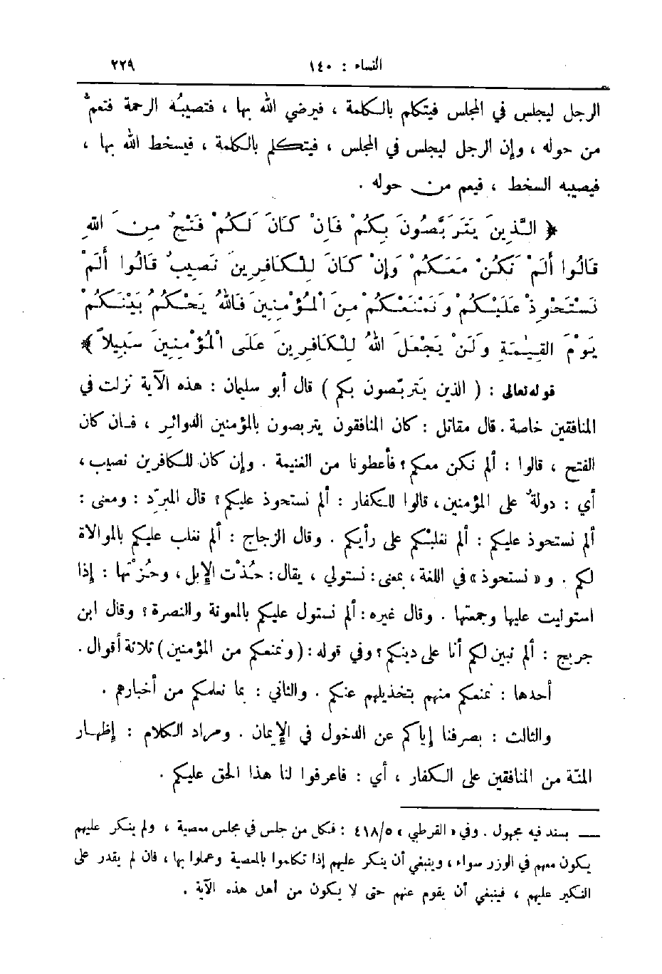 الرجل ليجلس في المجلس فيتكلم بالكلمة فيرضي الله بها فتصيبه الرحمة فتعم من حوله وإن الرجل ليجلس في المجلس فيتكلم بالكلمة فيسخط الله بها فيصيبه السخط فيعم من حوله الذين يتربصون بكم فان كان لكم فتح من الله قالوا ألم نكن معكم وإن كان للكافرين نصيب قالوا ألم نستحوذ عليكم ونمنعكم من المؤمنين فالله يحكم بينكم يوم القيمة ولن يجعل الله للكافرين على المؤمنين سبيلا