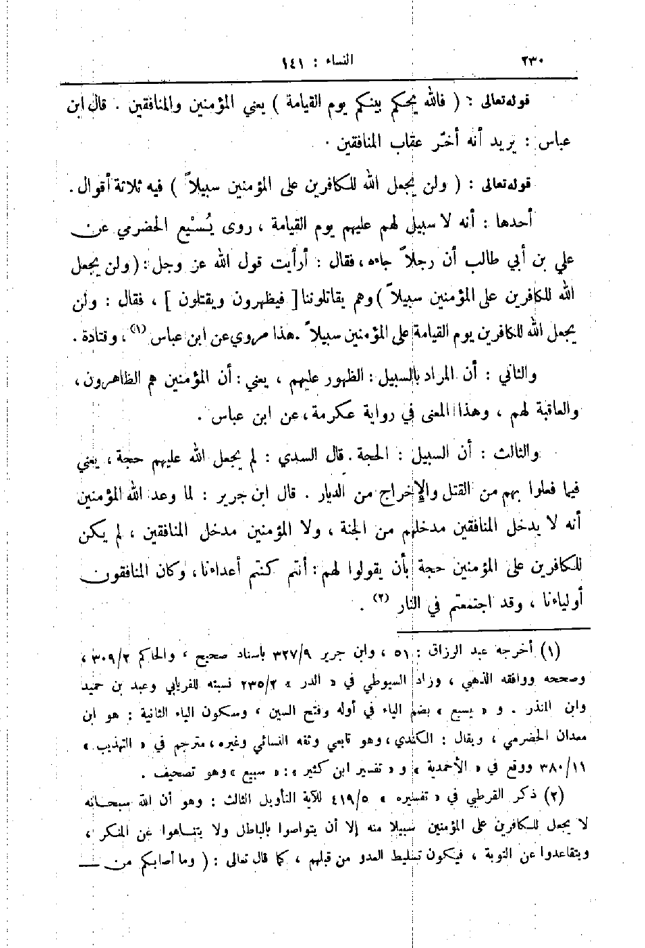 والثاني أن المراذ بالسبيل الظهور عليهم يعني أن المؤمنين هم الظاهرون والعاقبة لهم وهذا المعنى في رواية عكرمة عن ابن عباس والثالث أن السبيل الحجة قال السدي لم يجعل الله عليهم حجة يعني فيما فعلوا بهم من القتل والإخراج من الديار قال ابن جرير لما وعد الله المؤمنين أنه لا يدخل المنافقين مدخلهم من الجنة ولا المؤمنين مدخل المنافقين لم يكن للكافرين على المؤمنين حجة بأن يقولوا لهم أنتم كنتم أعداءنا وكان المنافقون أولياءنا وقد اجتمعتم في النار