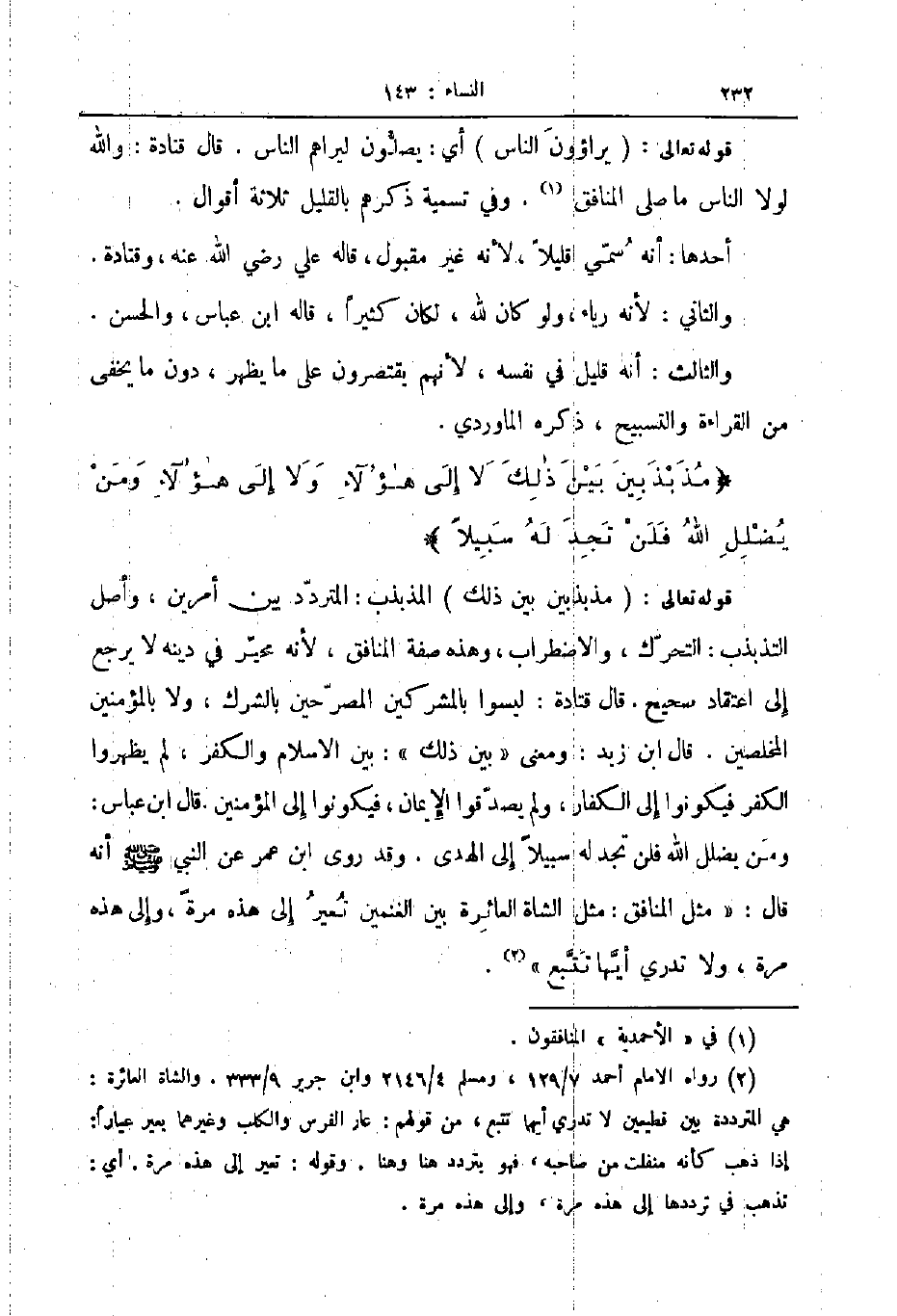 قوله تعالى مذبذبين بين ذلك المذبذب المتردد بين أمرين وأصل التذبذب التحرك والاضطراب وهذه صفة المنافق لأنه محير في دينه لا يرجع إلى اعتقاد صحيح قال قتادة ليسوا بالمشركين المصرحين بالشرك ولا بالمؤمنين المخلصين قال ابن زيد ومعنى بين ذلك بين الاسلام والكفر لم يظهروا الكفر فيكونوا إلى الكفار ولم يصدقوا الإيمان فيكونوا إلى المؤمنين قال ابن عباس ومن يضلل الله فلن تجد له سبيلا إلى الهدى وقد روى ابن عمر عن النبي صلى الله عليه و سلم أنه قال مثل المنافق مثل الشاة العائرة بين الغنمين تعير إلى هذه مرة وإلى هذه مرة ولا تدري أيها تتبع