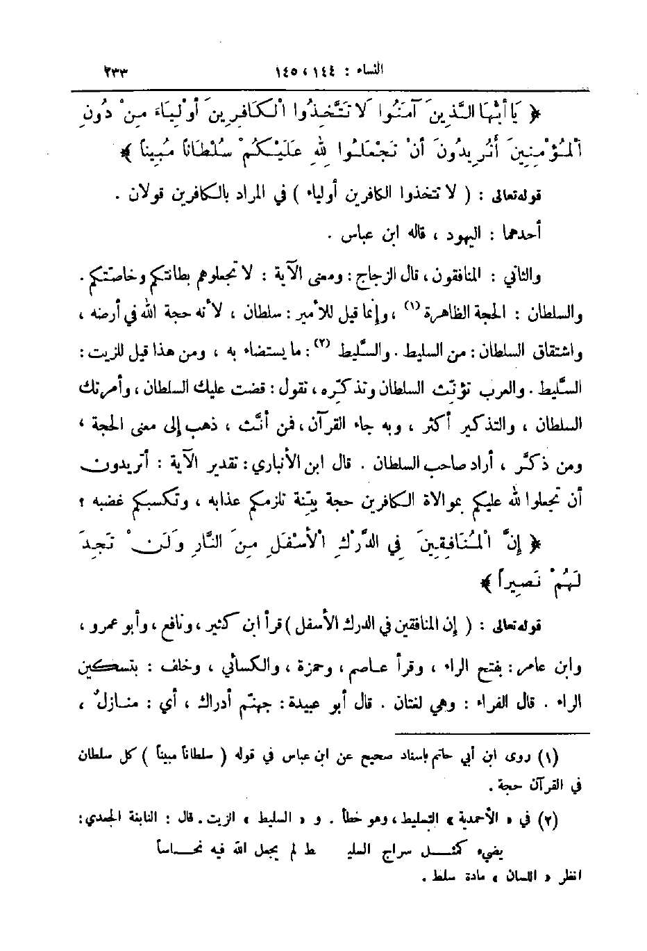 والسلطان الحجة الظاهرة وإنما قيل للأمير سلطان لأنه حجة الله في أرضه واشتقاق السلطان من السليط والسليط ما يستضاء به ومن هذا قيل للزيت السليط والعرب تؤنث السلطان وتذكره تقول قضت عليك السلطان وأمرتك السلطان والتذكير أكثر وبه جاء القرآن فمن أنث ذهب إلى معنى الحجة ومن ذكر أراد صاحب السلطان قال ابن الأنباري تقدير الآية أتريدون أن تجعلوا لله عليكم بموالاة الكافرين حجة بينة تلزمكم عذابه وتكسبكم غضبه إن المنافقين في الدرك الأسفل من النار ولن تجد لهم نصيرا