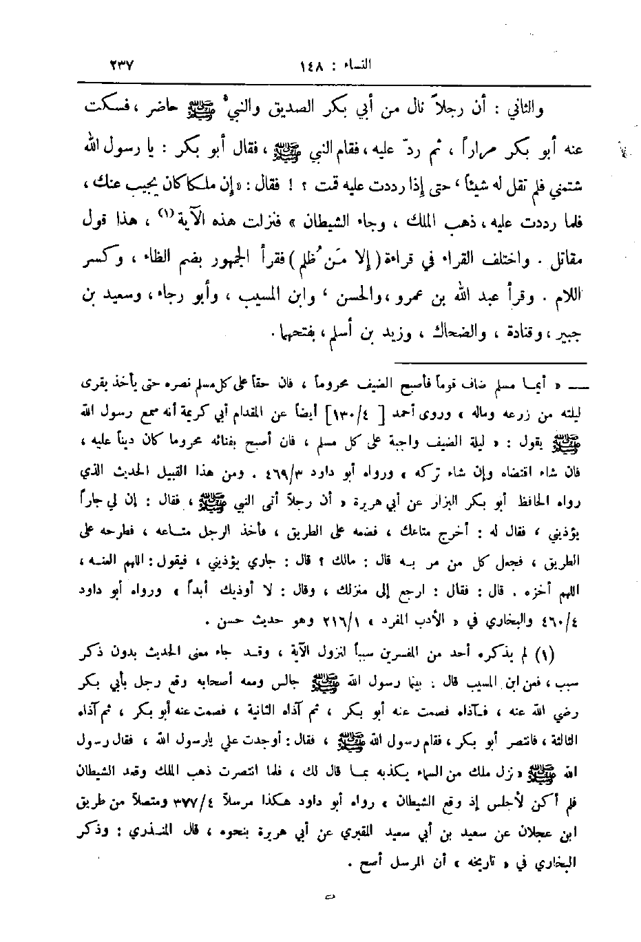 والثاني أن رجلا نال من أبي بكر الصديق والنبي صلى الله عليه و سلم حاضر فسكت عنه أبو بكر مرارا ثم رد عليه فقام النبي صلى الله عليه و سلم فقال أبو بكر يا رسول الله شتمني فلم تقل له شيئا حتى إذا رددت عليه قمت فقال إن ملكا كان يجيب عنك فلما رددت عليه ذهب الملك وجاء الشيطان فنزلت هذه الآية هذا قول مقاتل واختلف القراء في قراءة إلا من ظلم فقرأ الجمهور بضم الظاء وكسر اللام وقرأ عبد الله بن عمرو والحسن وابن المسيب وأبو رجاء وسعيد بن جبير وقتادة والضحاك وزيد بن أسلم بفتحهما